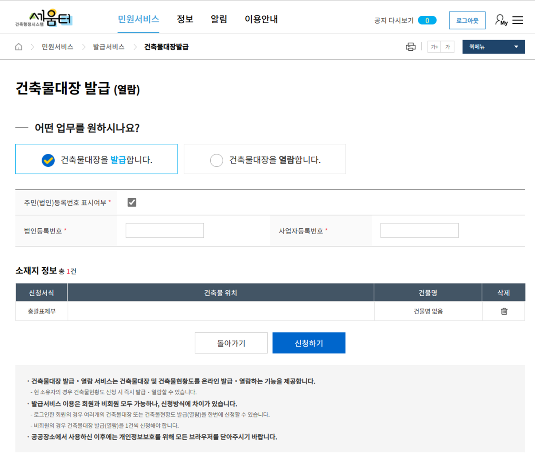 건축물대장의 발급 혹은 열람 둘 중에 본인이 원하는 업무를 선택 후 필요한 정보를 입력하고 "신청하기" 클릭~