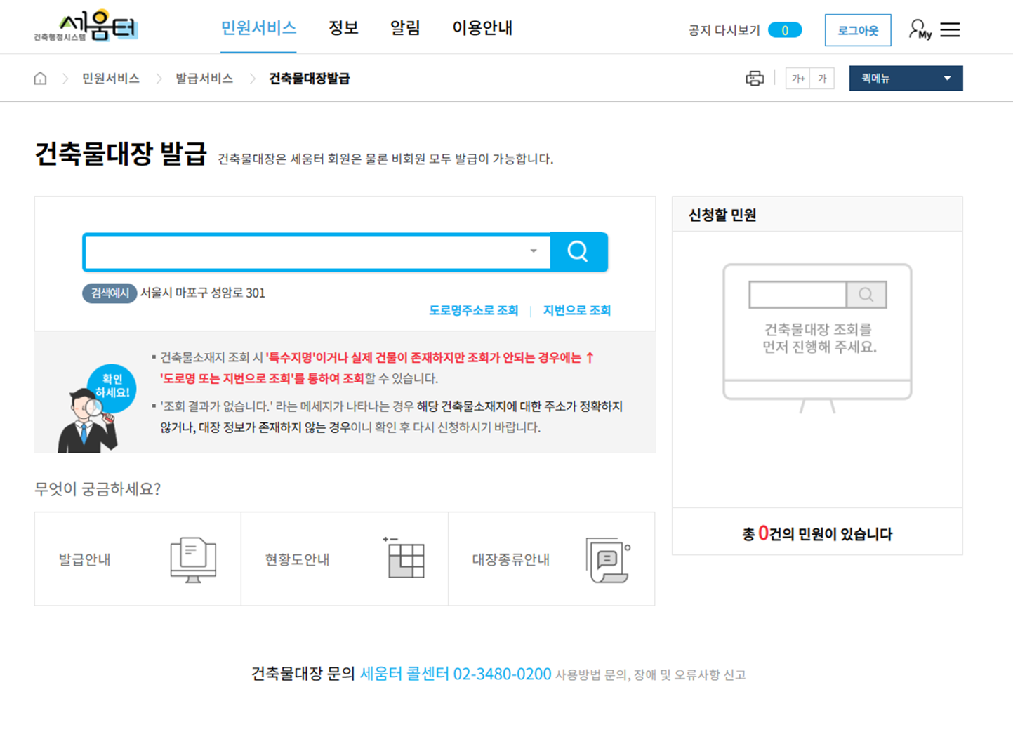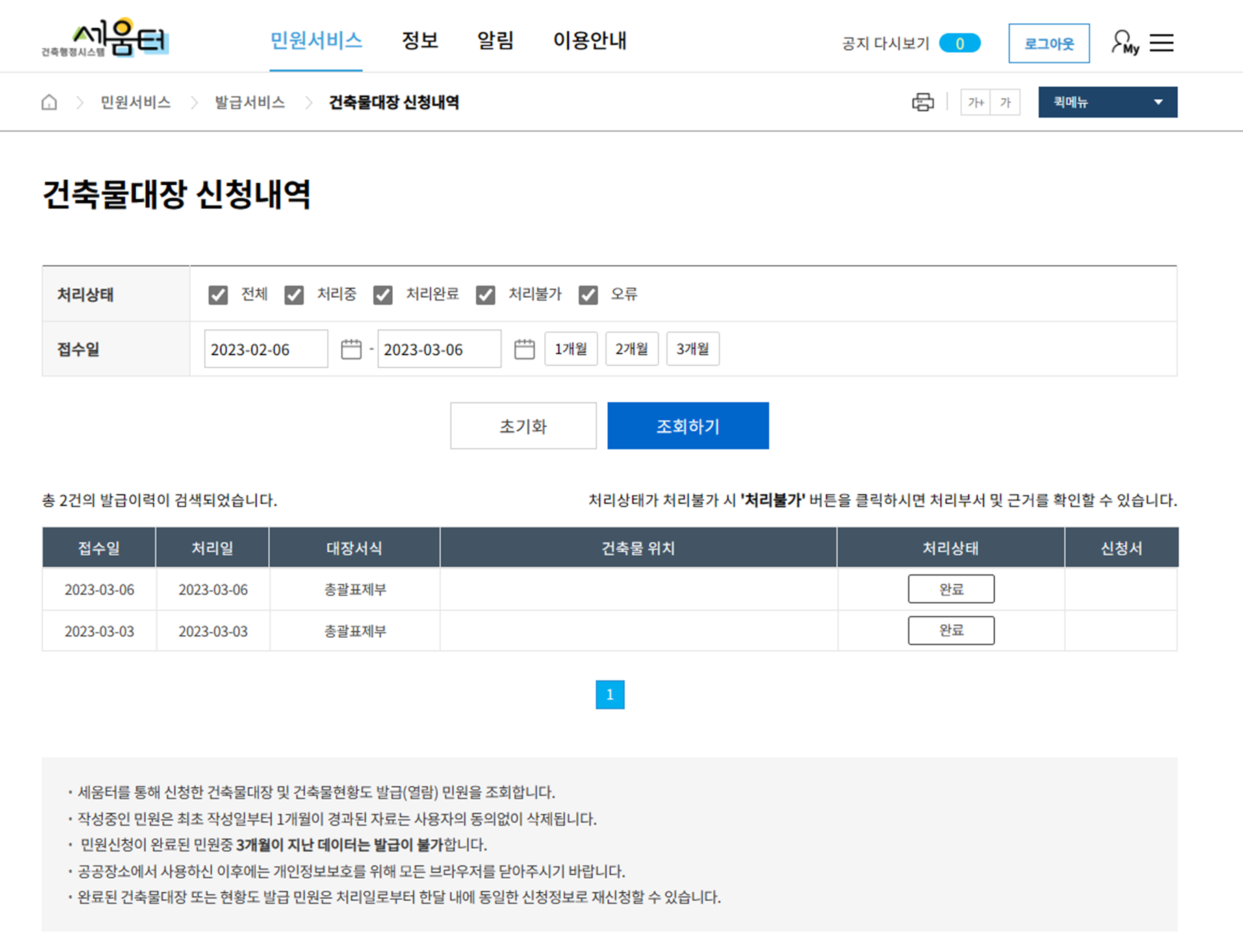 상기에 링크해둔 사이트인 "세움터"라는 사이트가 이런 업무를 간편하게 볼 수 있는 사이트입니다.
