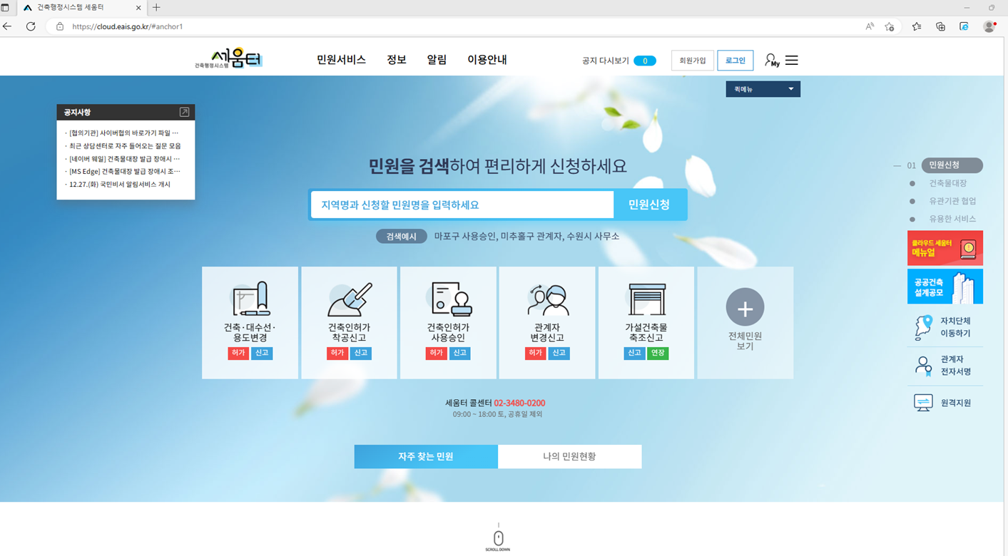 세움터 사이터에 접속을 하면 보이는 메인 화면입니다.