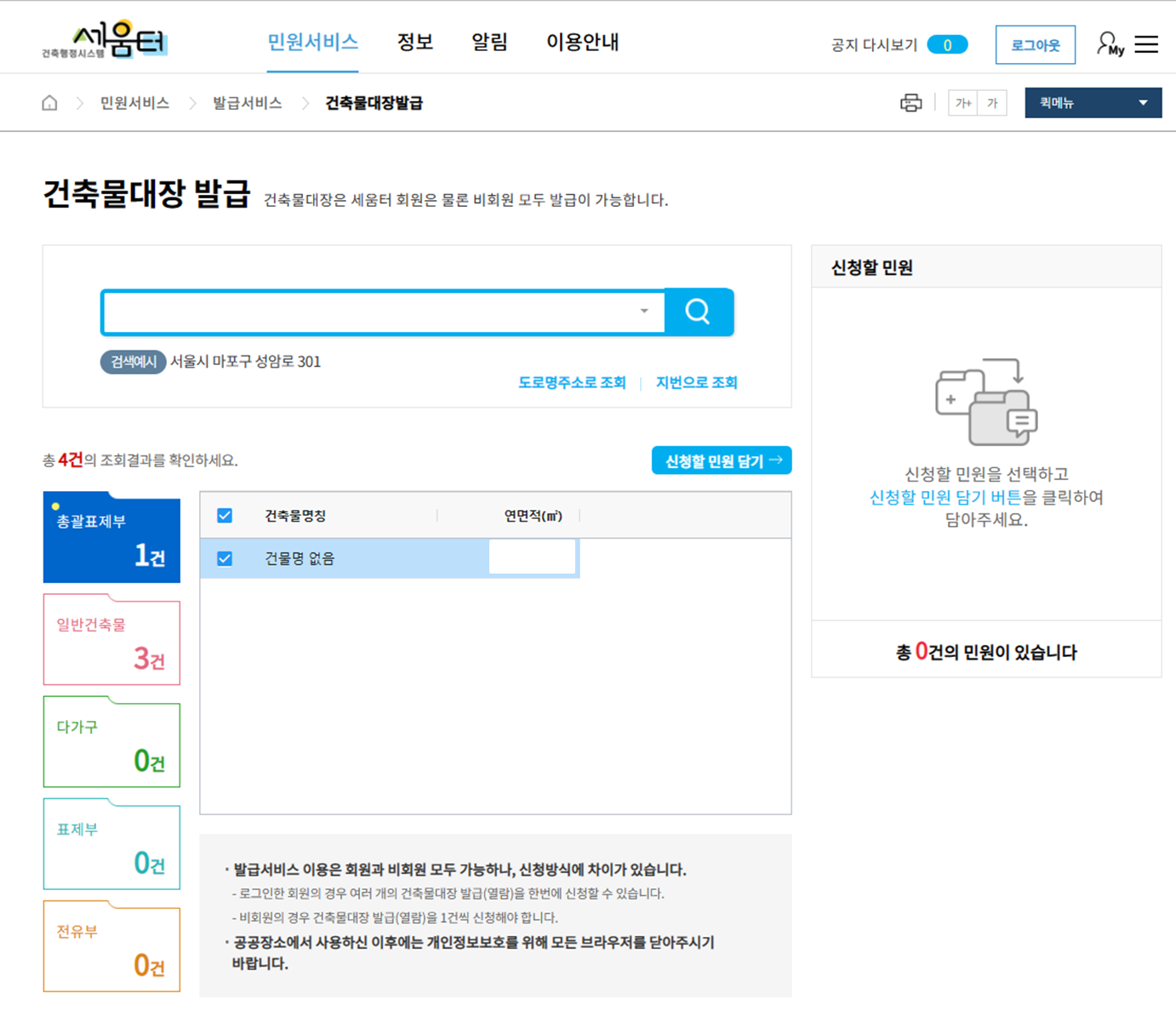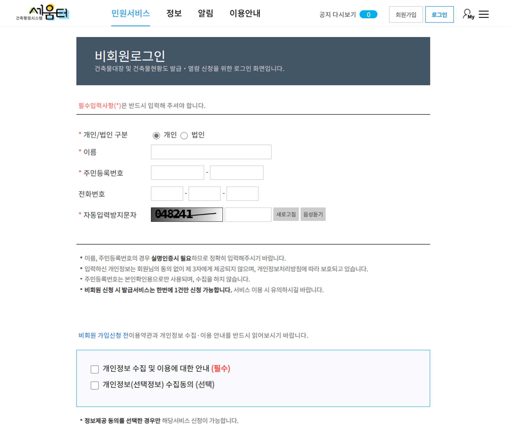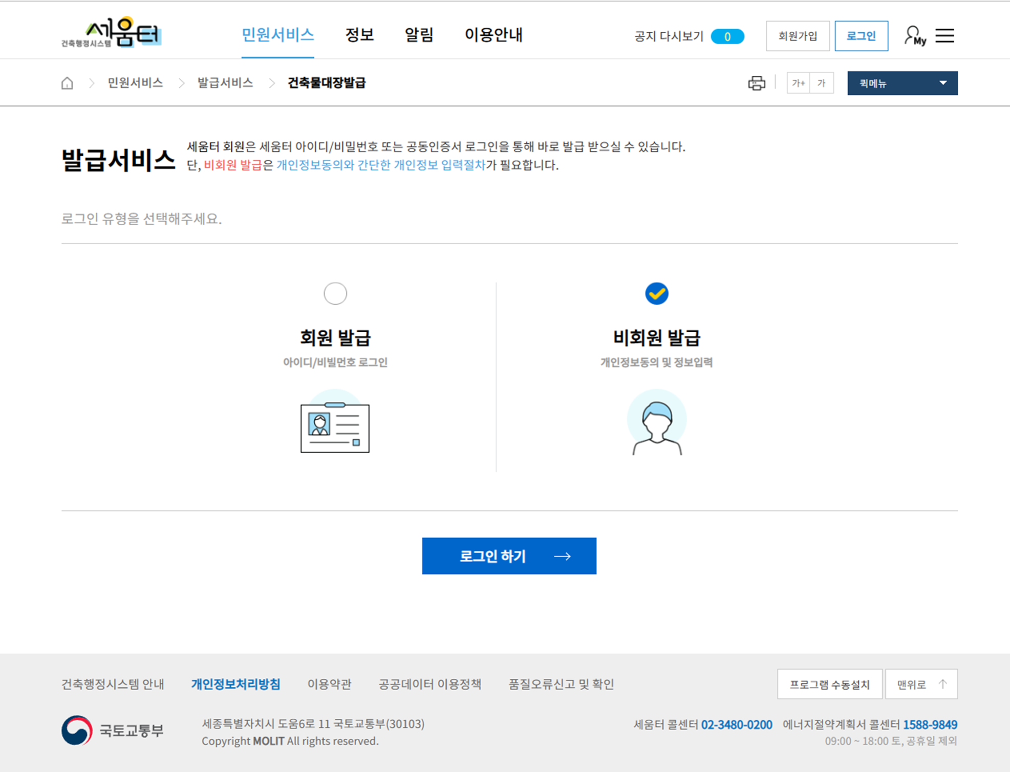 세움터의 건축물대장 발급 시스템은 비회원도 진행이 가능하기 때문에 저는 비회원 발급으로 진행하였습니다.