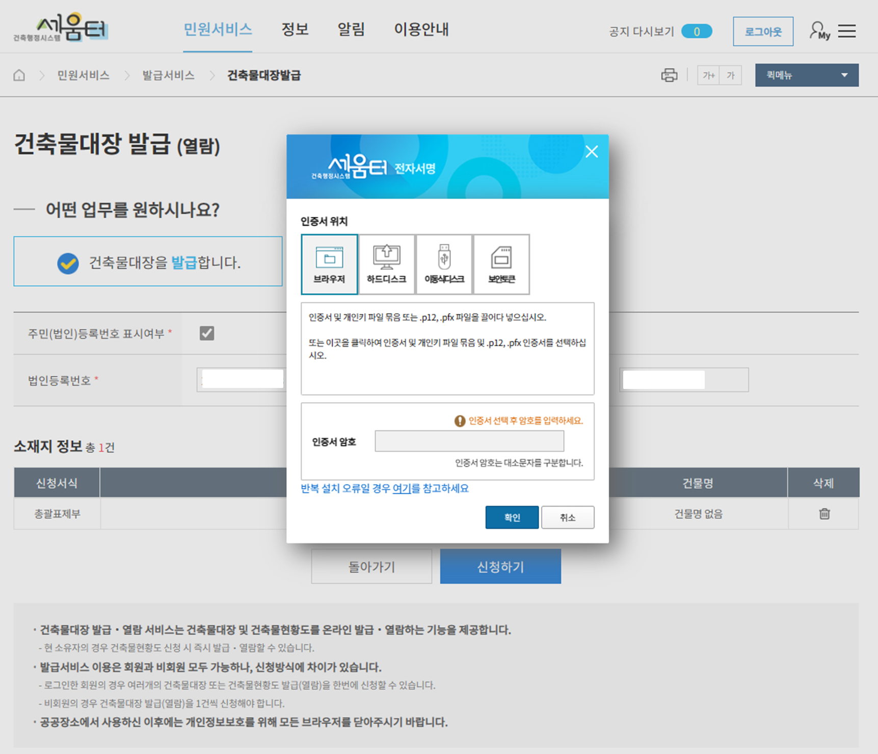"신청하기"를 클릭하면 상기와 같이 공인인증서를 입력하는 팝업창이 나옵니다.