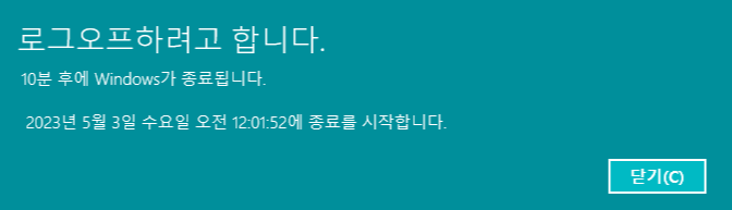 원하는 타이머까지 입력 후 확인을 누르게 되면 상기 이미지와 같이 로그오프 알림 메시지가 떠오르는 걸 볼 수 있습니다.