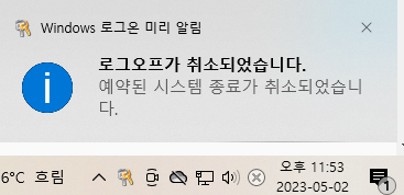 이렇게 입력을 하고 나서 확인 버튼을 누르면 로그오프 취소 알림이 뜨는 걸 볼 수 있습니다.