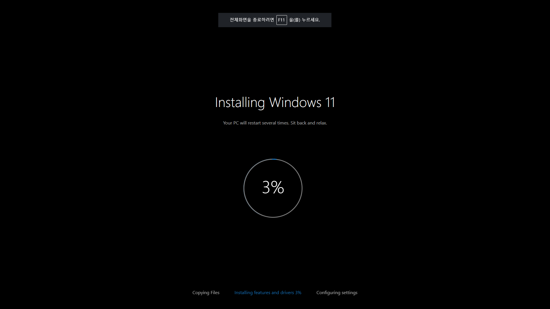 예를 들어 저는 윈도우 11의 설치 화면을 클릭해서 F11 키를 눌러 확대를 하니 정말 업데이트가 진행되는 것 마냥