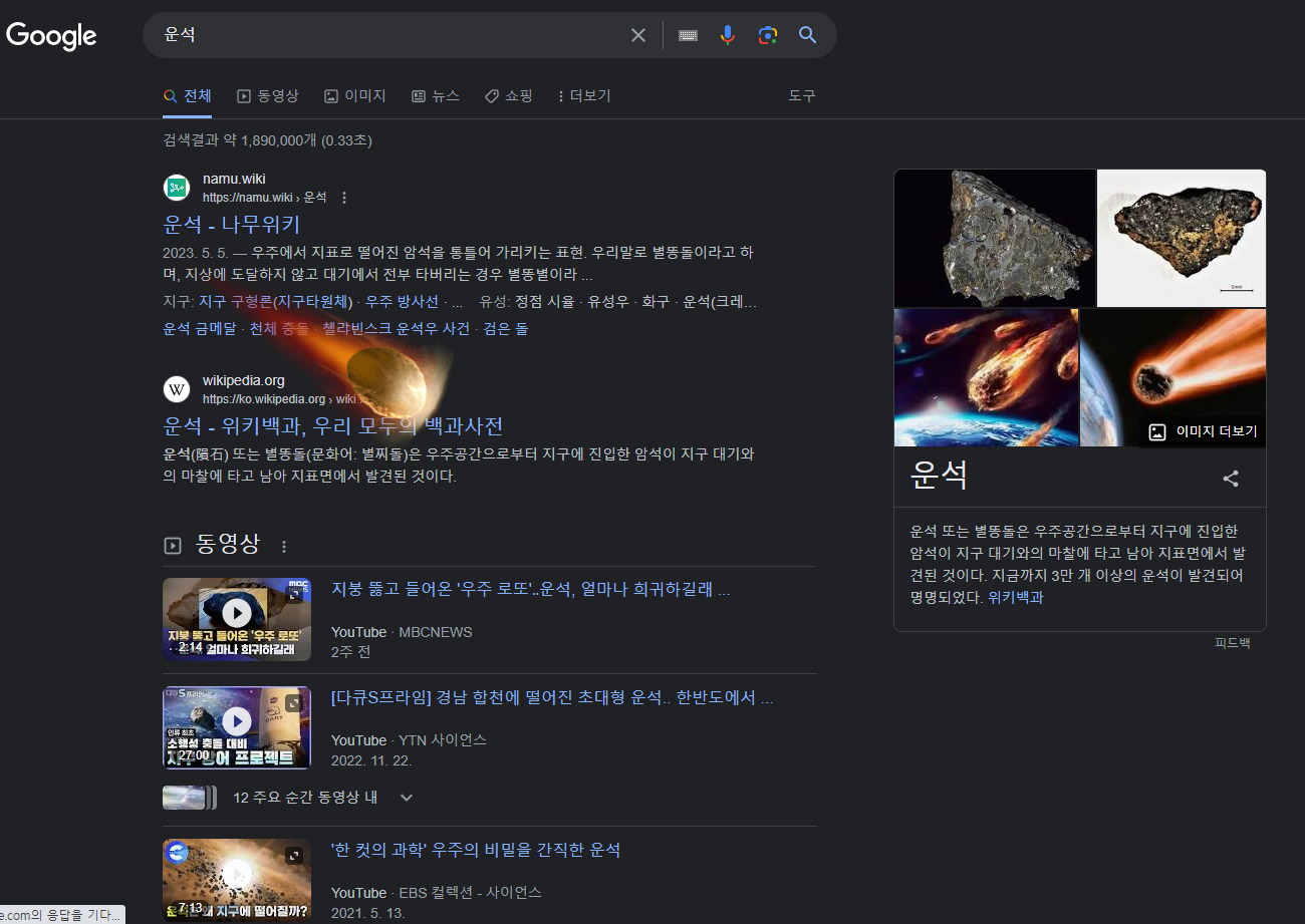 구글 검색창을 열어주고 "운석"이라고 키워드를 입력 후 엔터를 눌러 주면