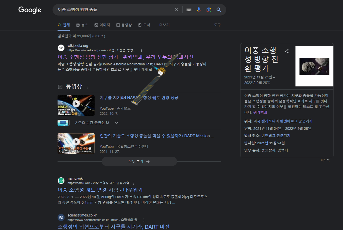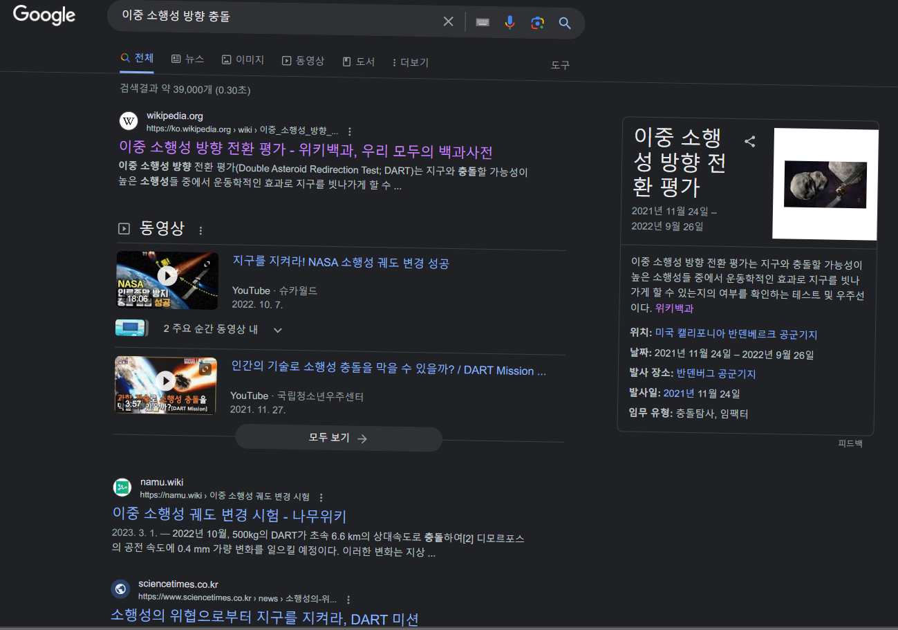 구글 검색창을 열어주고 "이중 소행성 방향 충돌"이라고 키워드를 입력 후 엔터키를 눌러 주면