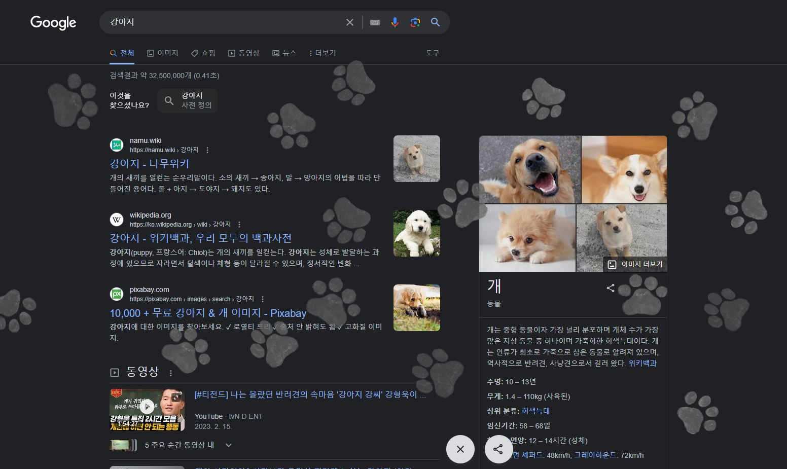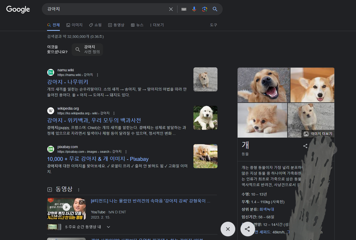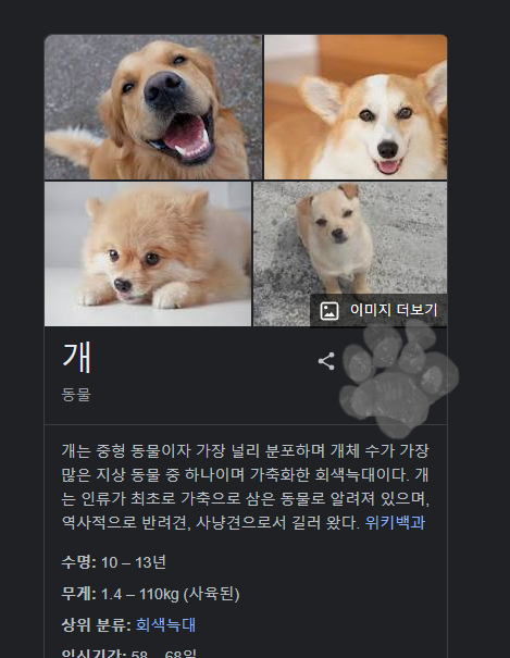 매번 해왔듯이 구글 검색창에 강아지 라는 키워드를 입력하고 엔터키를 눌러주면