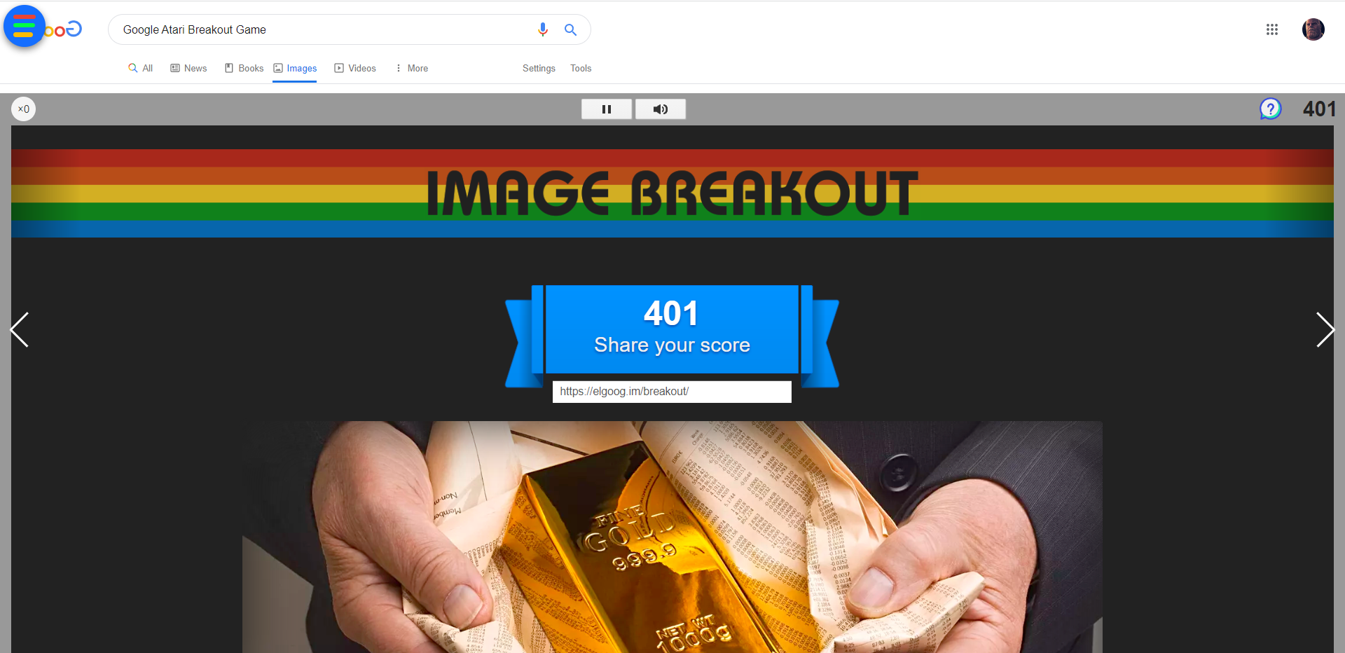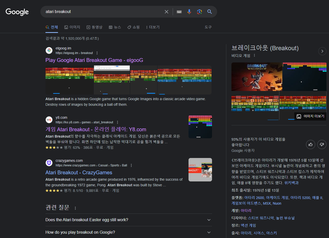 맨 첫번째 검색 결과로 나오는 "Play Google Atari Breakout Game - elgooG"를 눌러 주시면 벽돌 깨기가 실행됩니다.