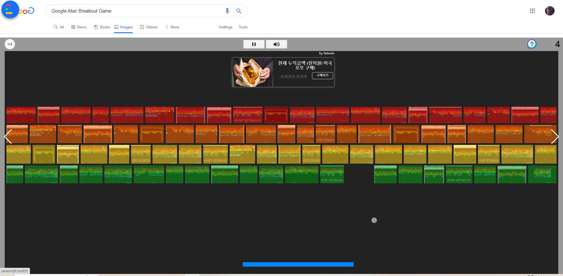 구글 검색 이스터에그로 플레이 하는 벽돌깨기 게임 "Atari breakout"