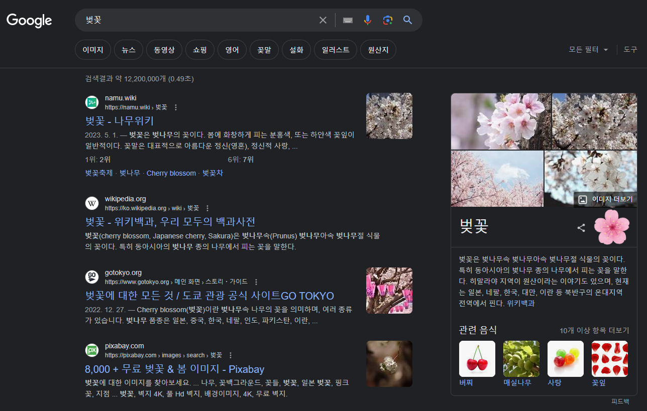"벚꽃"을 검색하면 하기와 같은 검색 결과가 나오는 걸 볼 수 있으실 겁니다.
