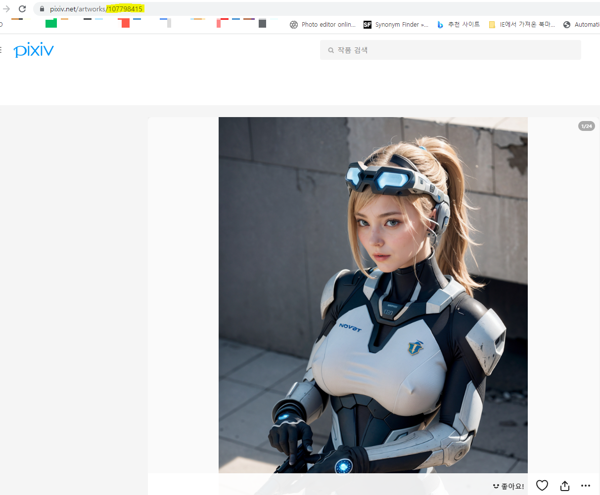 예를 들어서 위의 Ai생성 노바 짤의 작품번호는 "107798415"인데 아래 공각기동대의 타치코마 캐릭터 작품 번호는 "105343916"입니다. 이렇게 번호만 바꿔가면서 찾아도 작품을 찾는 데는 전혀 문제 될 것이 없습니다.