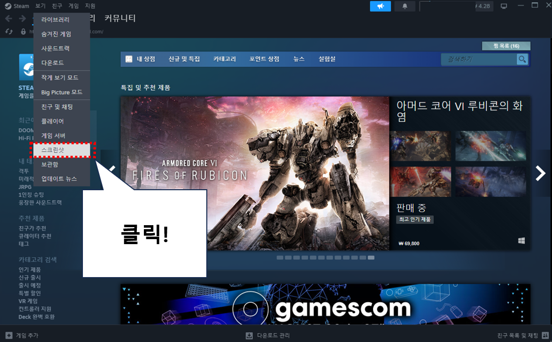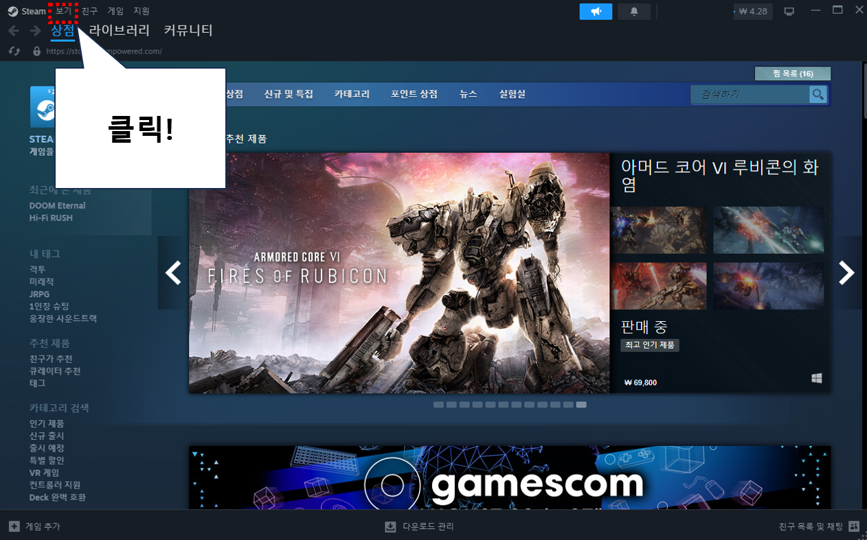 1. 일단 스팀 클라이언트를 실행하고 나서 클라이언트 좌측 최상단의 메뉴 중 "보기" 를 클릭해 줍니다.