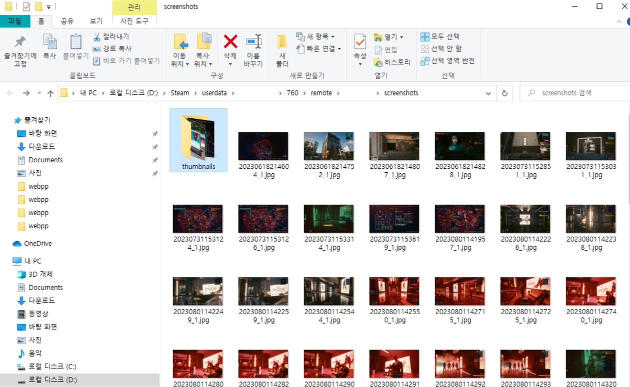 이렇게 내가 스크린샷을 찍은 게임들의 실제 저장 위치를 바로 윈도우 탐색기를 띄워져서 보여줍니다.