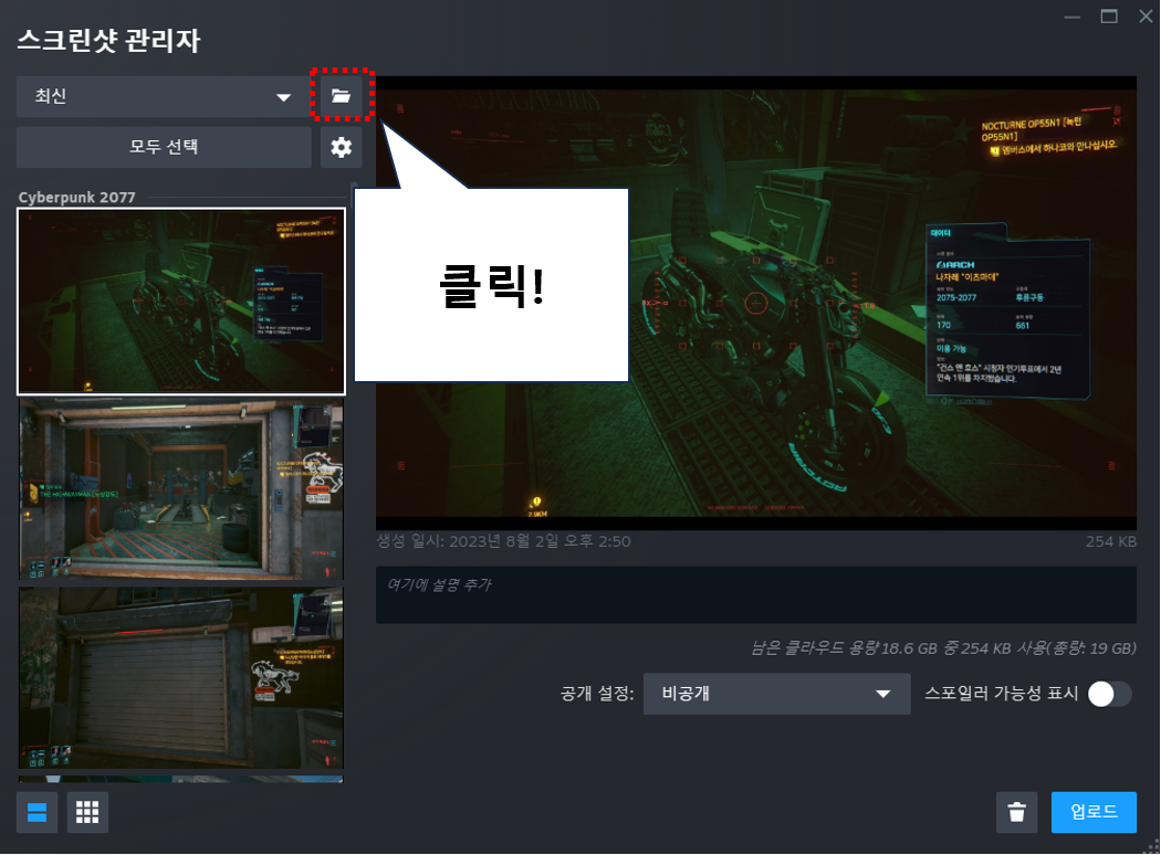 여기서 스팀 커뮤니티에 업로드를 하거나 아예 지우는 선택이 가능합니다.