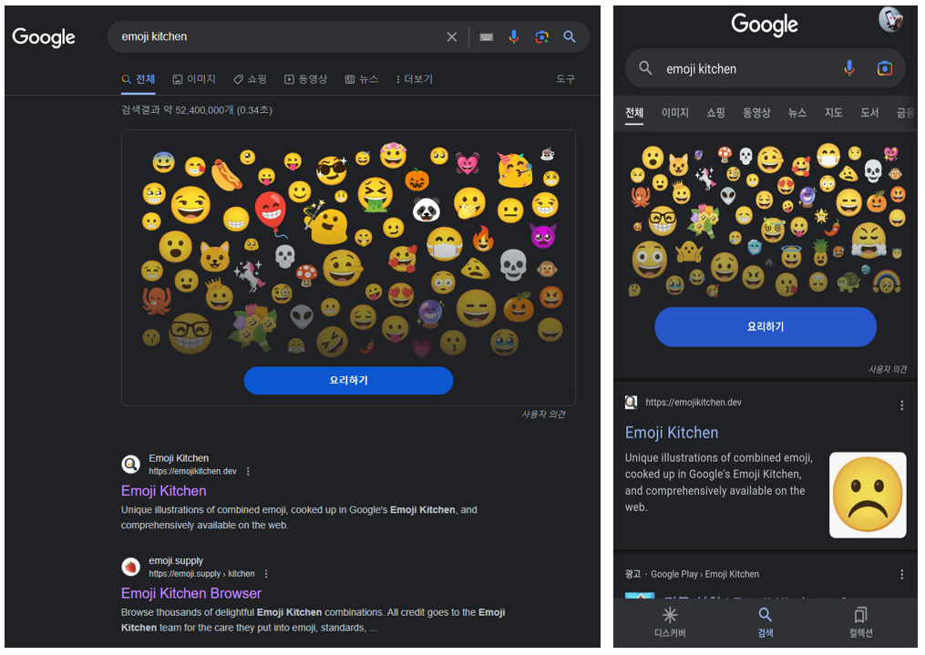더불어서 안드로이드 구글 앱에서도 동일하게 Emoji kitchen 을 검색하면 웹 검색 결과와 똑같이