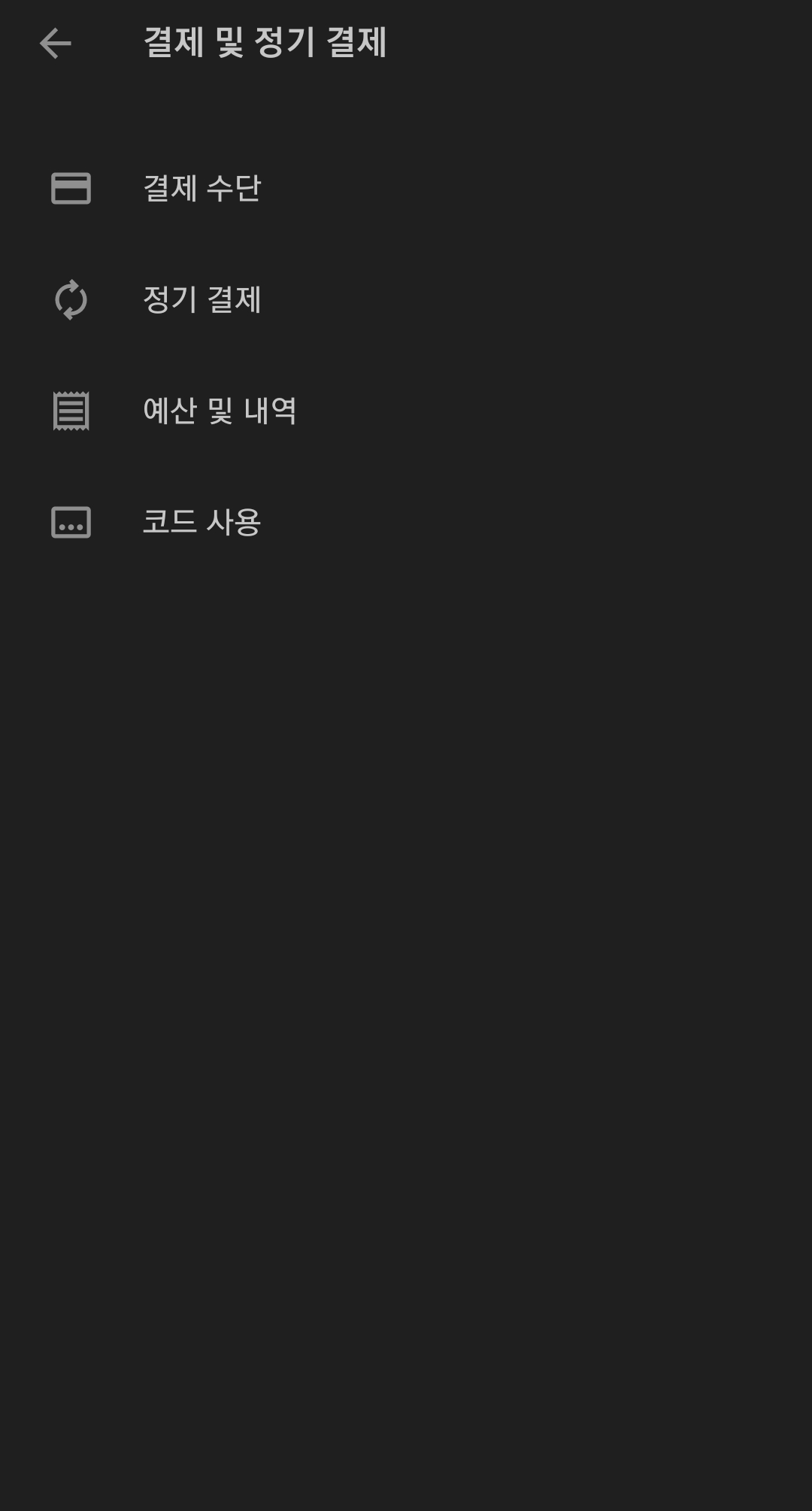 포인트 적립 혹은 추가를 하기 위해서는 해당 팝업 메뉴 중 "결제 및 정기 결제"를 클릭합니다.