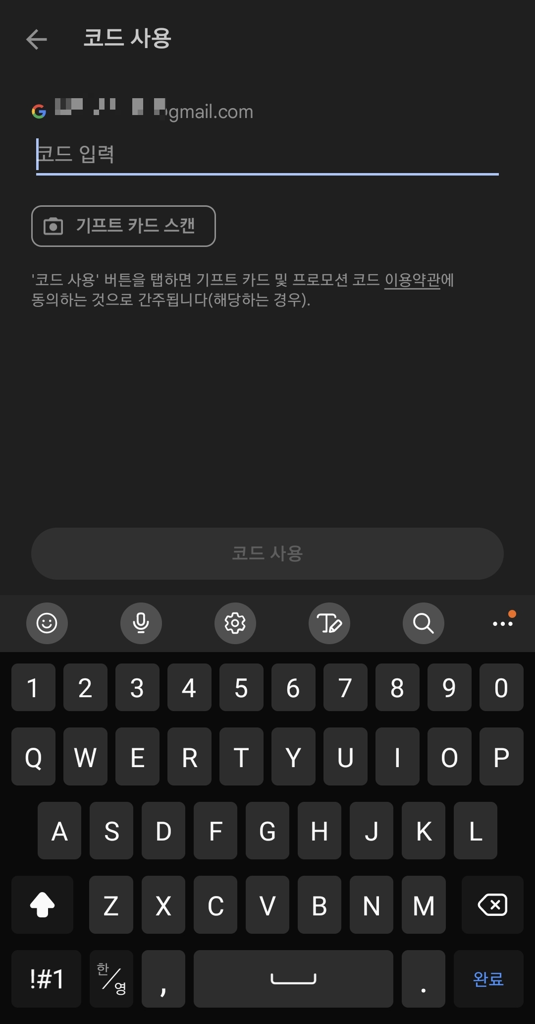"코드 사용" 이라는 메뉴를 누르게 되면 본인이 가지고 있는 구글 플레이 포인트를