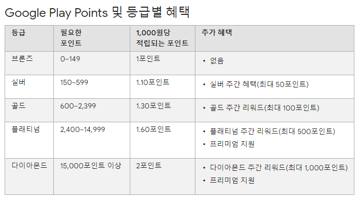 참고로 구글 플레이 포인트는 등급에 따라 적립되는 포인트 양과