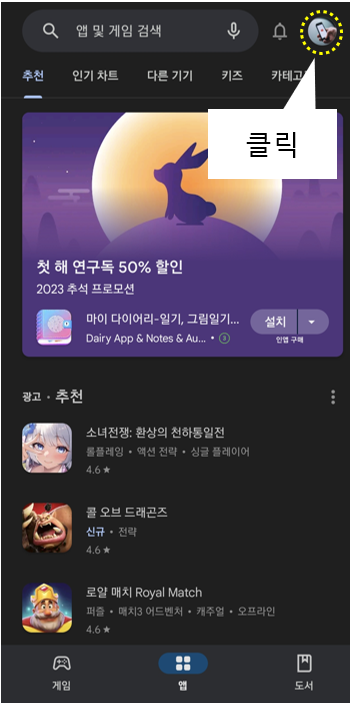 Play 스토어를 실행 후 우측 상단 본인의 계정 아이콘을 클릭해 줍니다.