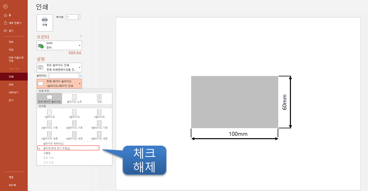 파워포인트 문서 프린트 진행시 삽입된 객체 실제 사이즈로 프린트하기