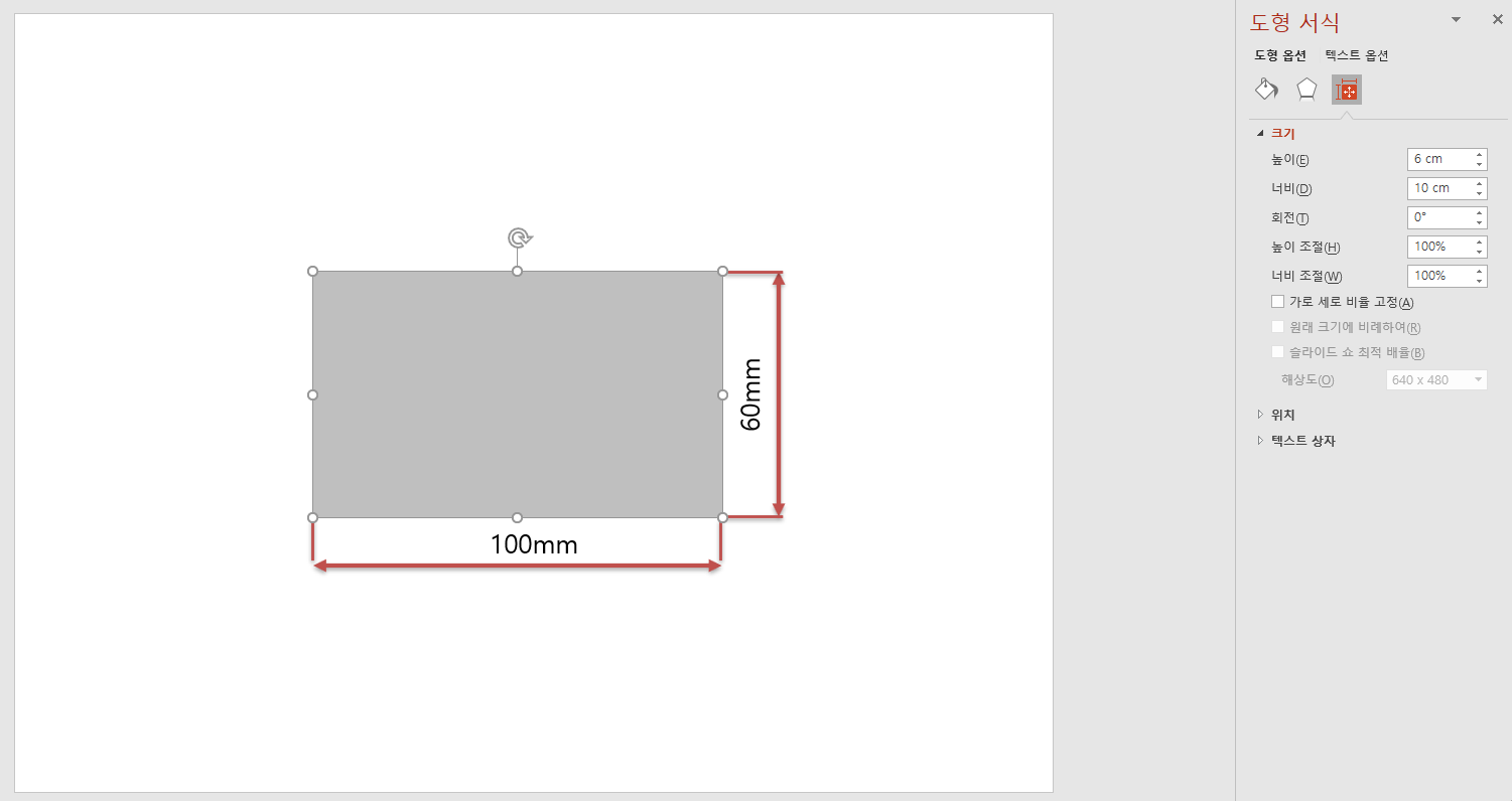 삽입한 직사각형 도형의 크기 설정은 높이는 60mm x 너비는 100mm로 설정을 하고 프린트를 해 보았습니다.