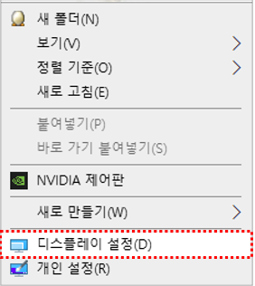 윈도우10 기준 바탕화면에서 마우스 우측 클릭을 해준 뒤 "디스플레이 설정(D)"를 눌러 줍시다.
