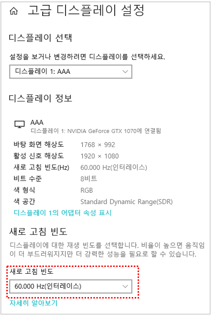 고급 디스플레이 설정으로 넘어오면 화면 하단에 "새로 고침 빈도" 관련 설정 항목이 있습니다.