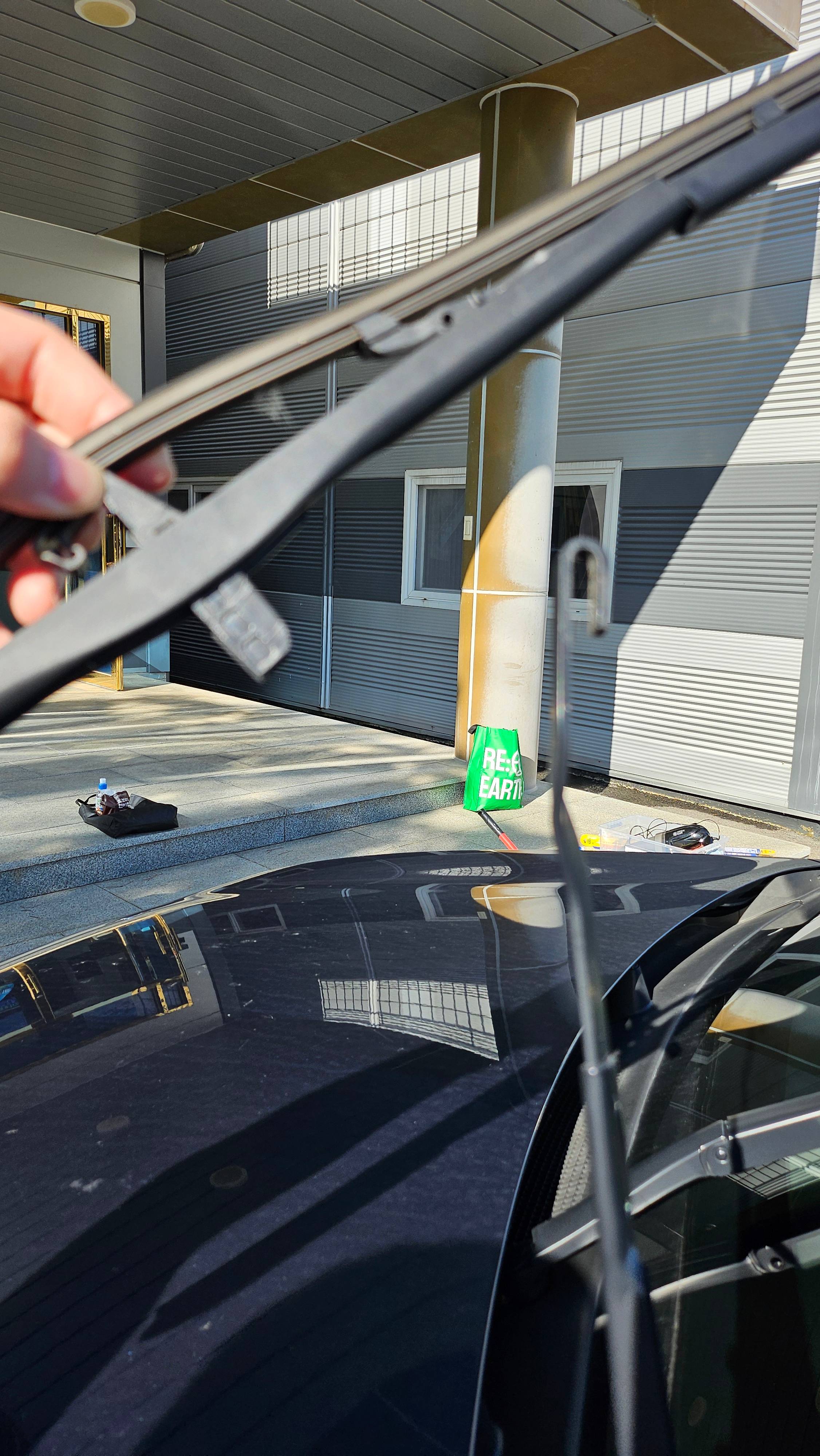 와이퍼의 락을 잘 해제하셨다면 차량 바깥으로 뻗어있는 방향의 위쪽 기존 와이퍼를 잡아당겨서