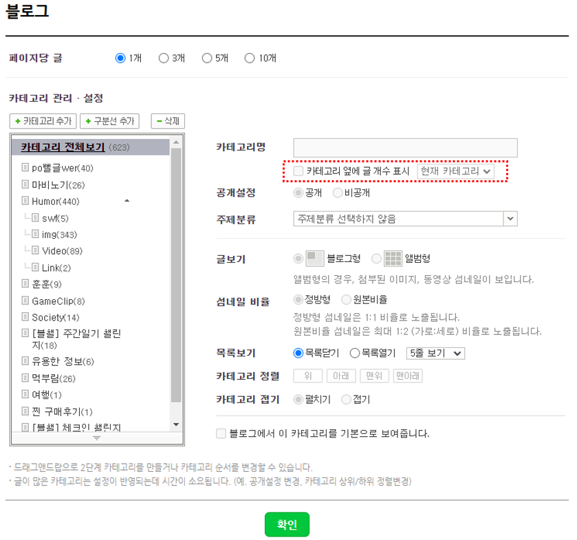 "카테고리 옆에 글 개수 표시"라는 항목이 있습니다.