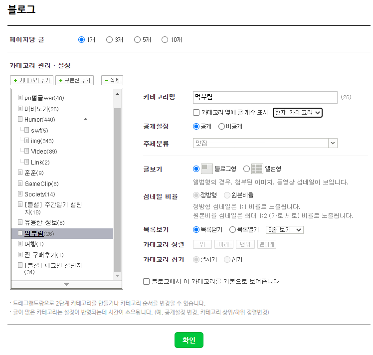 먹부림이라는 카테고리를 눌렀을 때 "카테고리 옆에 글 개수 표시" 항목이 체크가 안돼서