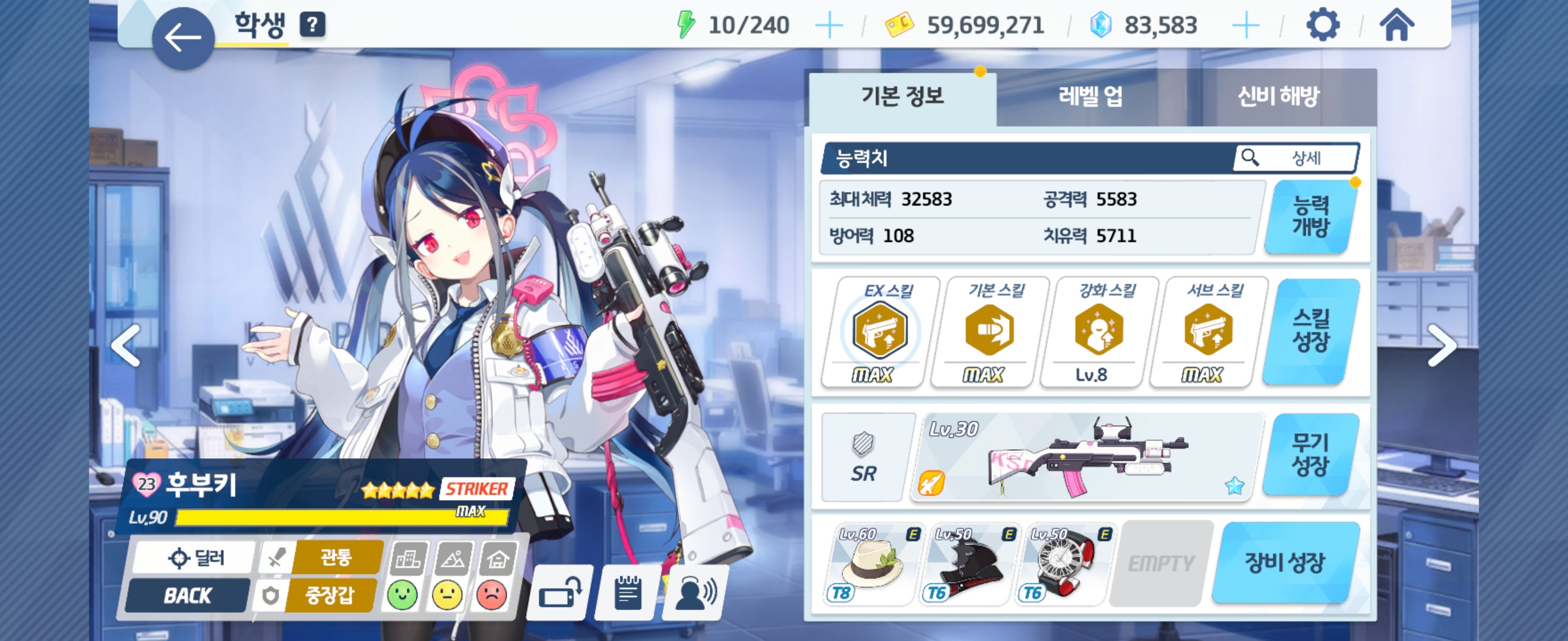 후부키 Lv90 - 전무 1성, Ex 스킬 Max, 기본 스킬 Max, 강화 스킬 Lv8, 서브 스킬 Max