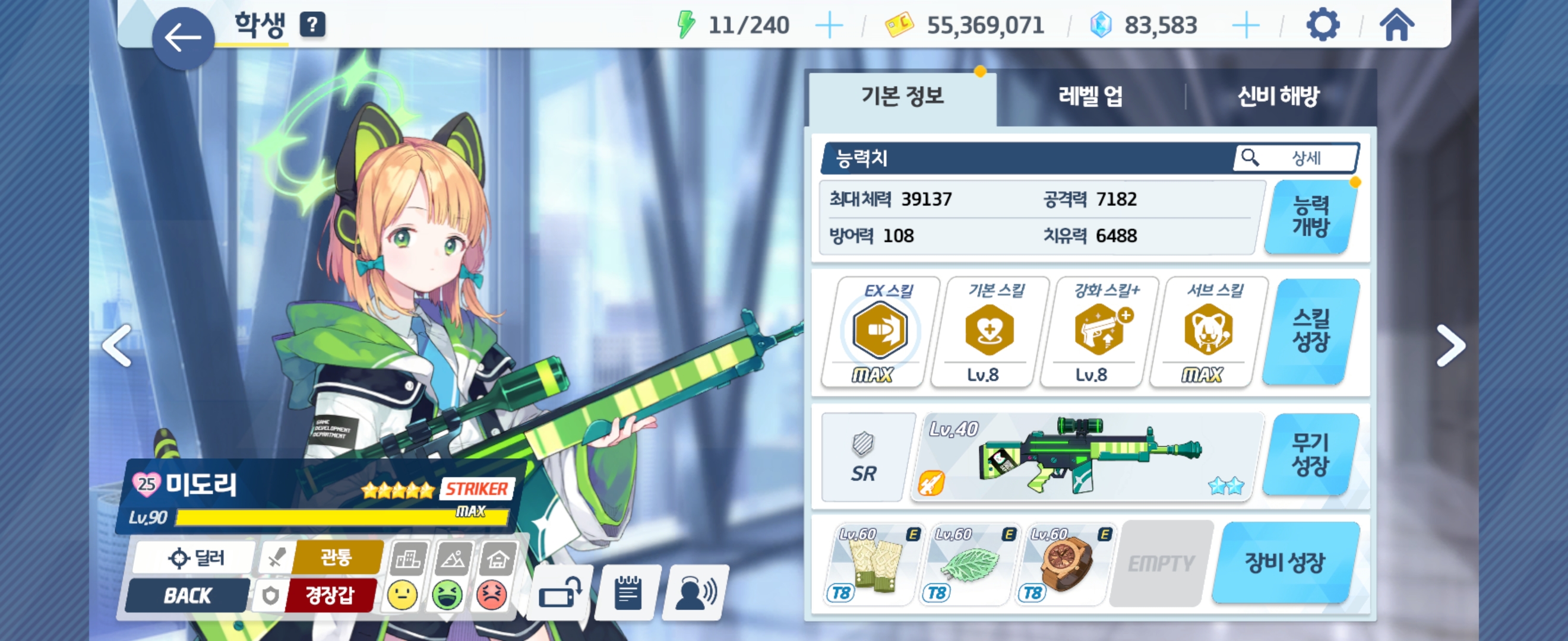 미도리 Lv90 - 전무 2성, Ex 스킬 Max, 기본 스킬 Lv8, 강화 스킬+ Lv8, 서브 스킬 Max
