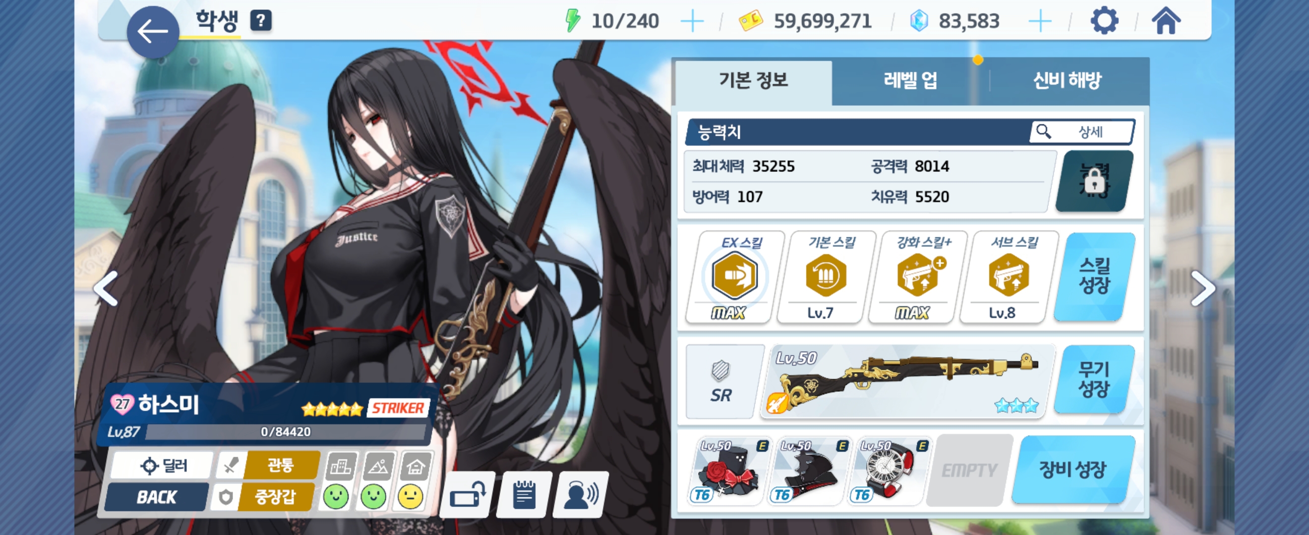 하스미 Lv87 - 전무 3성, Ex 스킬 Max, 기본 스킬 Lv7, 강화 스킬+ Max, 서브 스킬 Lv8