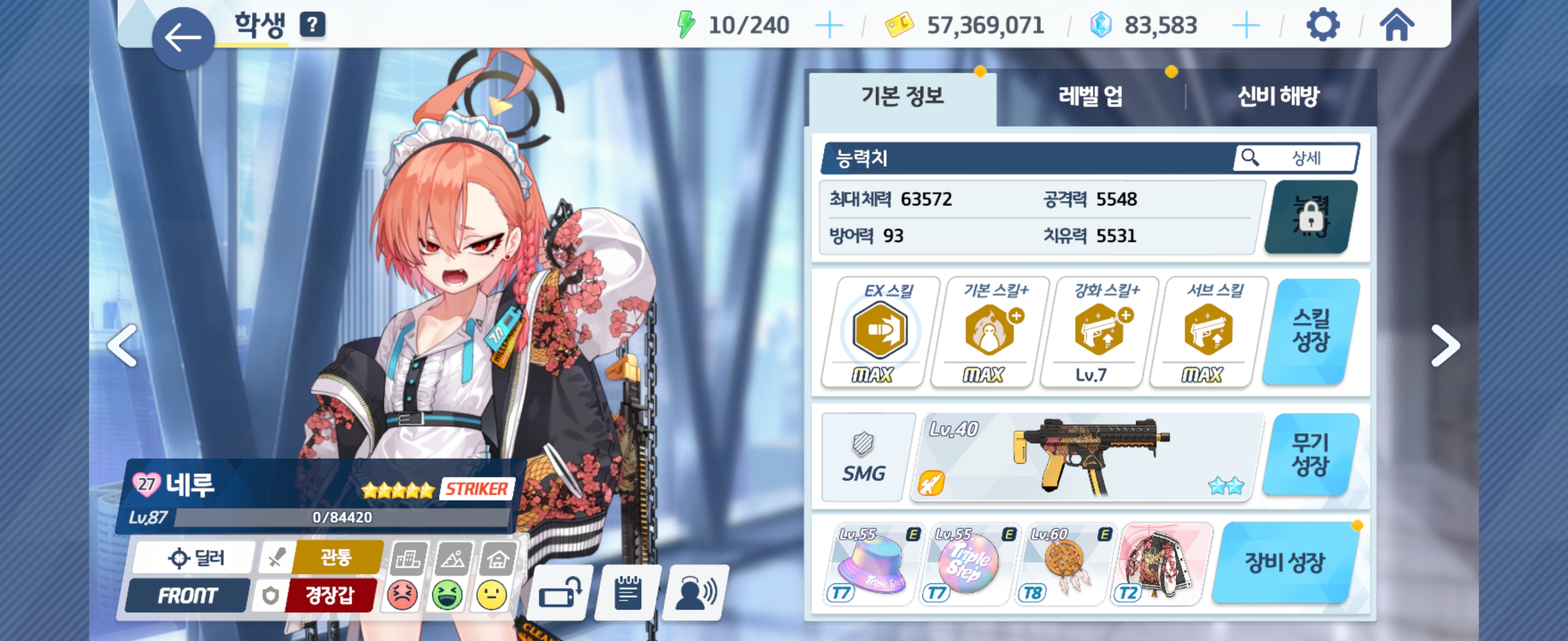 네루 Lv87 - 전무 2성, Ex 스킬 Max, 기본 스킬 Max, 강화 스킬+ Lv7, 서브 스킬 Max, 애용품 2성