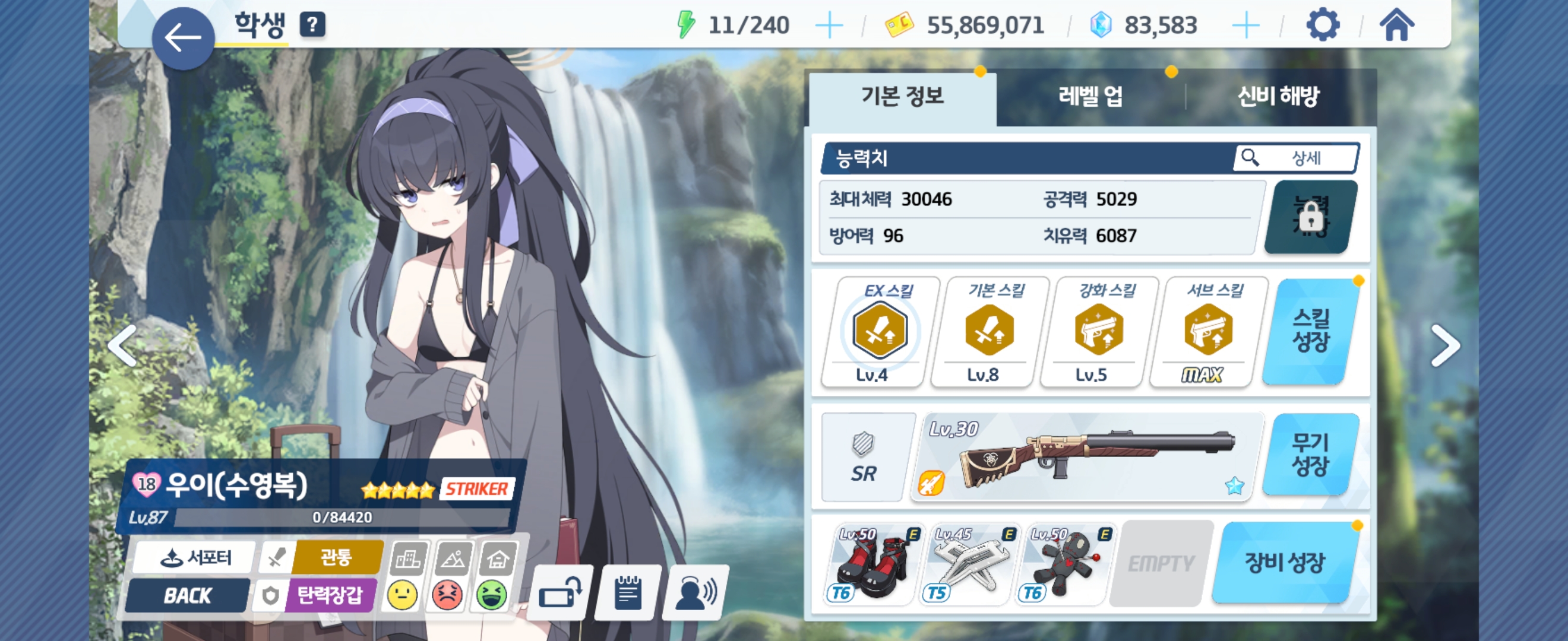 우이(수영복) Lv87 - 전무 1성, Ex 스킬 Lv4, 기본 스킬 Lv8, 강화 스킬 Lv5, 서브 스킬 Max