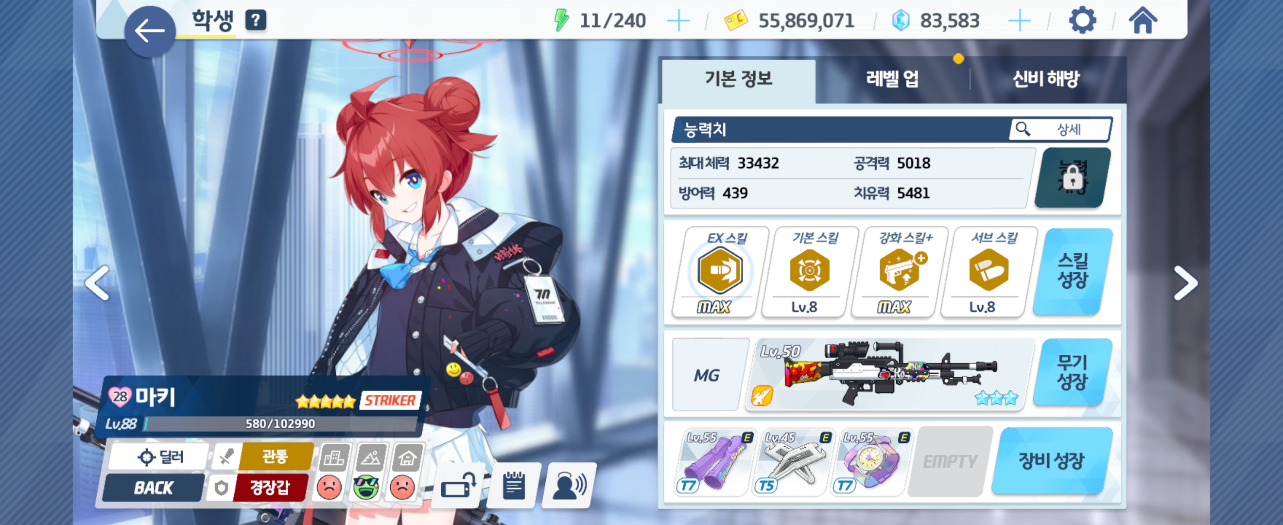마키 Lv88 - 전무 3성, Ex 스킬 Max, 기본 스킬 Lv8, 강화 스킬+ Max, 서브 스킬 LV8