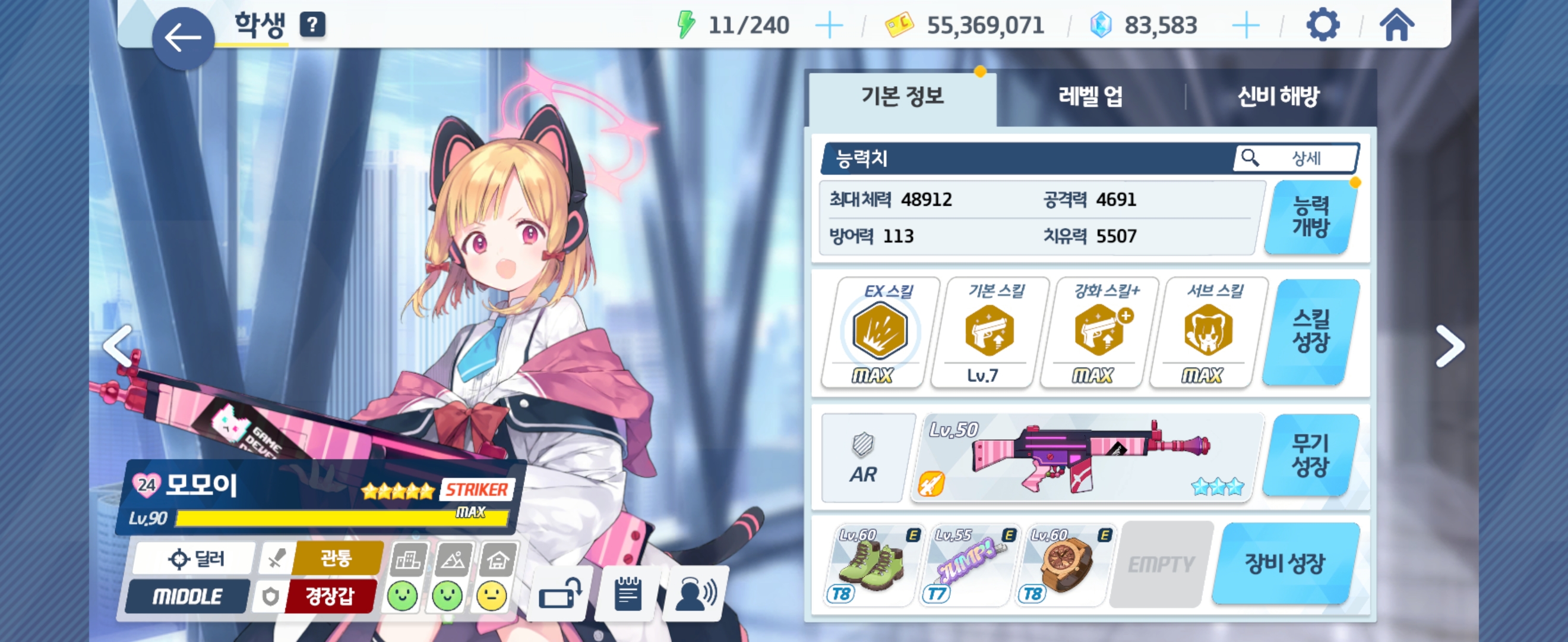 모모이 Lv90 - 전무 3성, Ex 스킬 Max, 기본 스킬 Lv7, 강화 스킬+ Max, 서브 스킬 Max