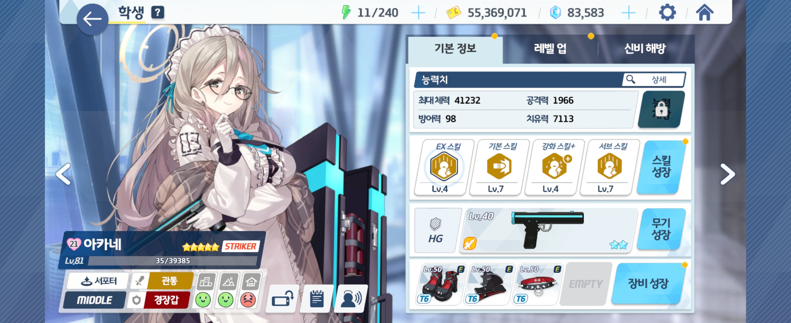 아카네 Lv81 - 전무 2성, Ex 스킬 Lv4, 기본 스킬 Lv7, 강화 스킬+ Lv4, 서브 스킬 Lv7