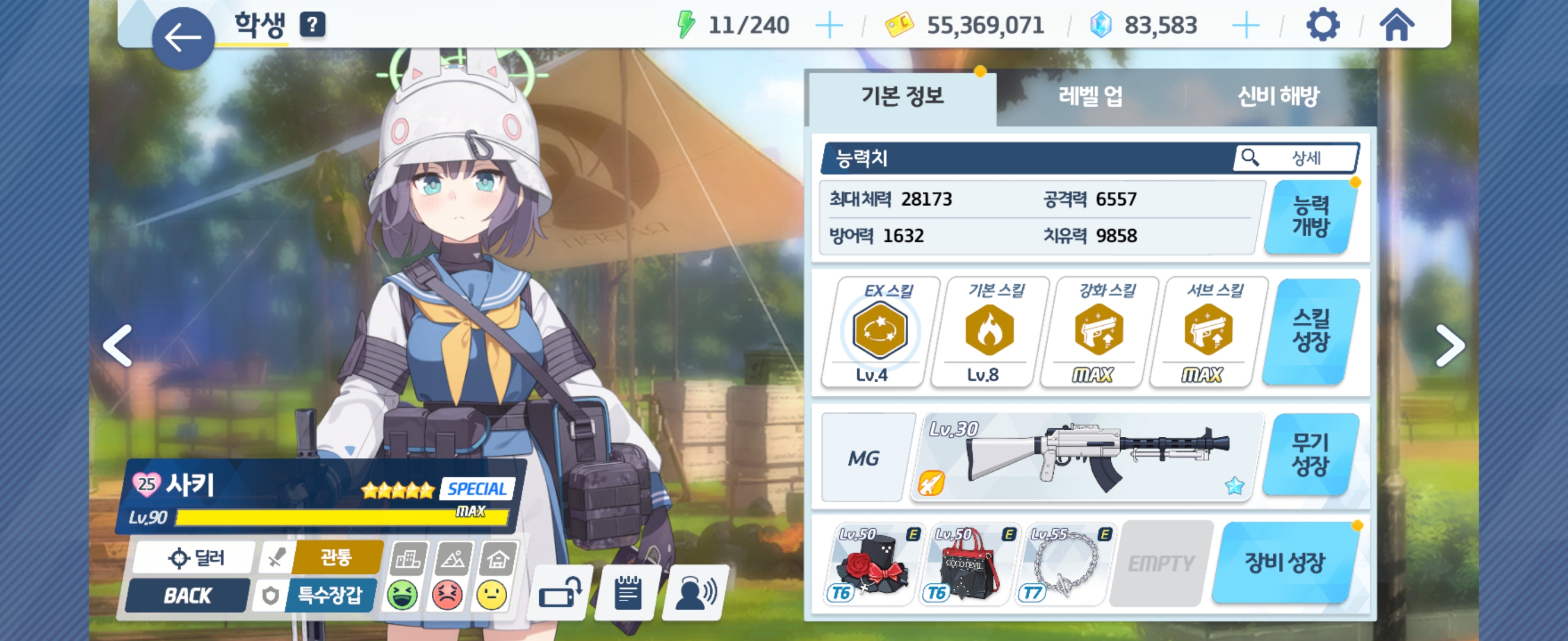 사키 Lv90 - 전무 1성, Ex 스킬 Lv4, 기본 스킬 Lv8, 강화 스킬 Max, 서브 스킬 Max