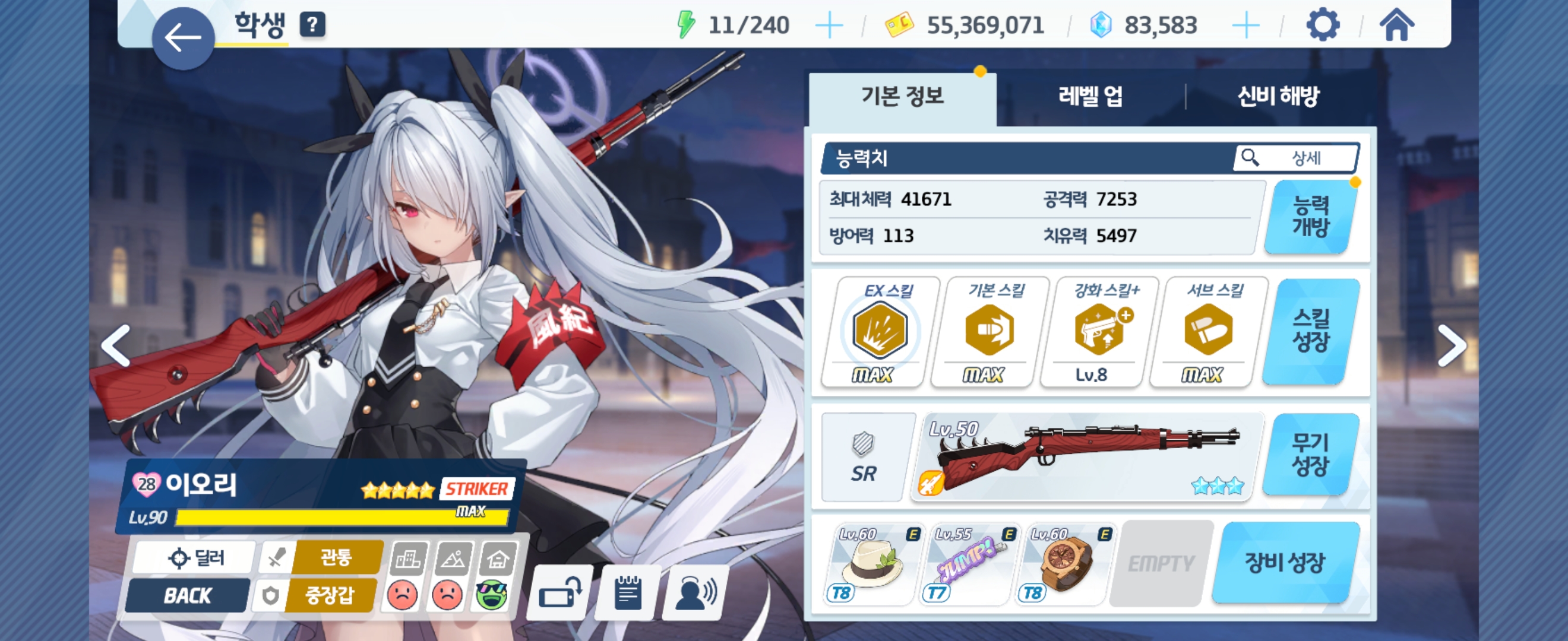 이오리 Lv90 - 전무 3성, Ex 스킬 Max, 기본 스킬 Max, 강화 스킬+ Lv8, 서브 스킬 Max