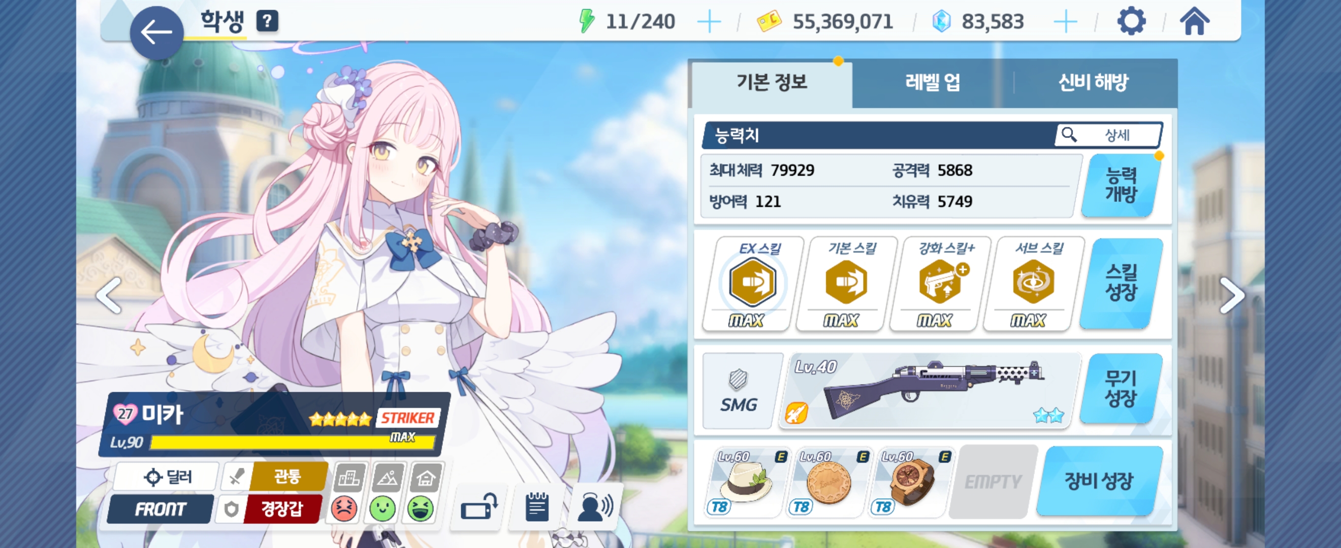 미카 Lv90 - 전무 2성, Ex 스킬 Max, 기본 스킬 Max, 강화 스킬+ Max, 서브 스킬 Max