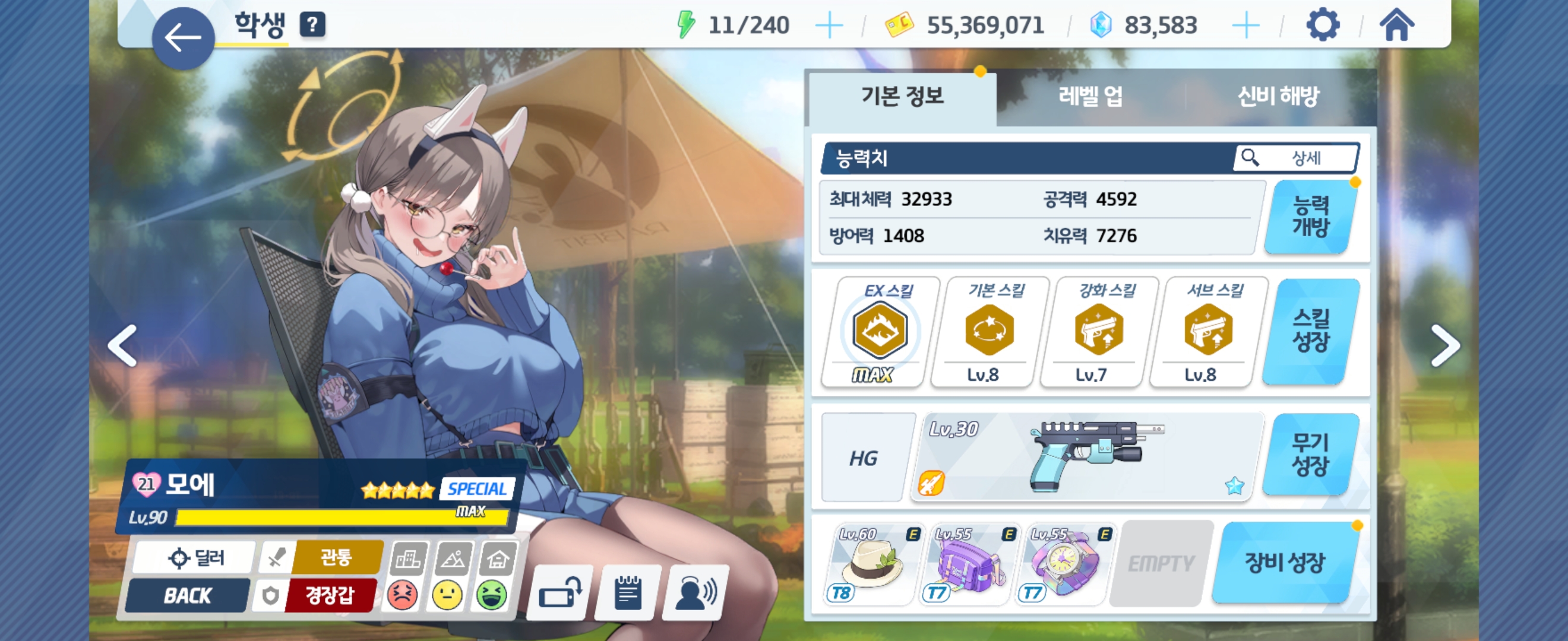 모에 Lv90 - 전무 1성, Ex 스킬 Max, 기본 스킬 Lv8, 강화 스킬 Lv7, 서브 스킬 Lv8