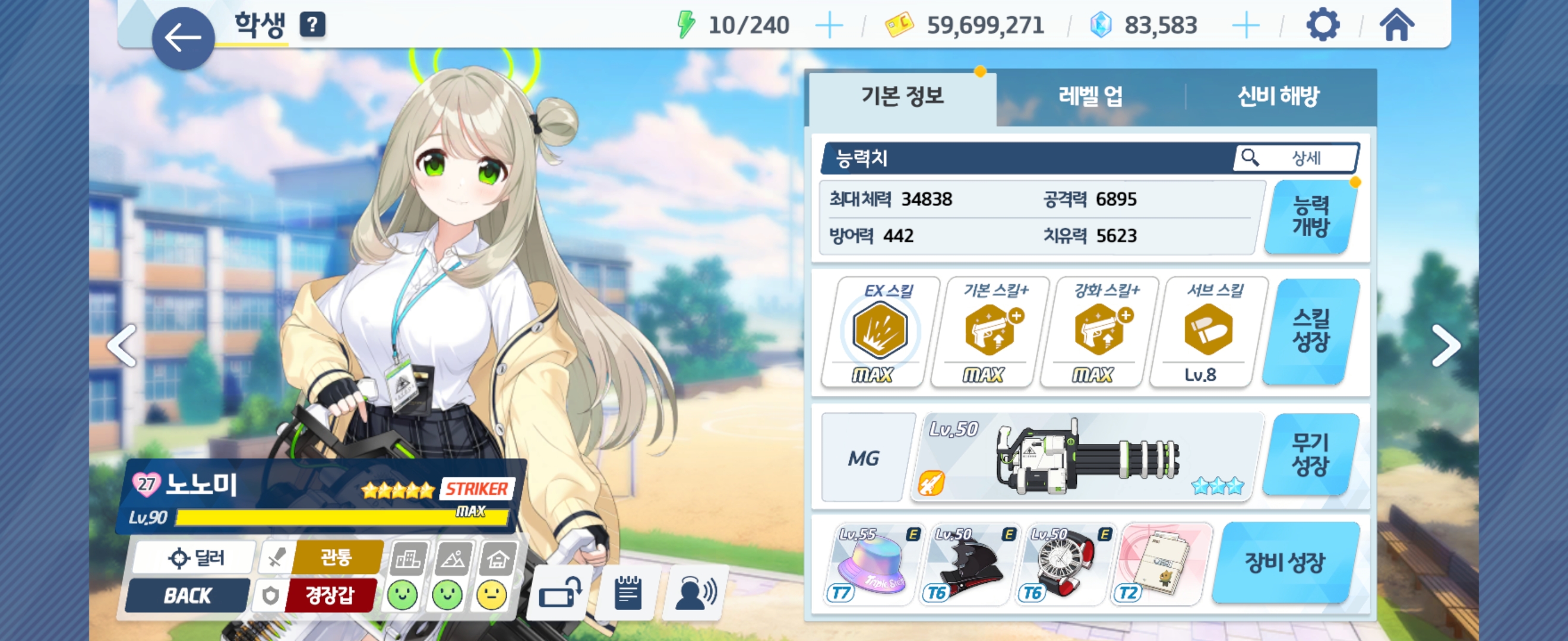 노노미 Lv90 - 전무 3성, Ex 스킬 Max, 기본 스킬+ Max, 강화 스킬+ Max, 서브 스킬 Lv8, 애용품 2성