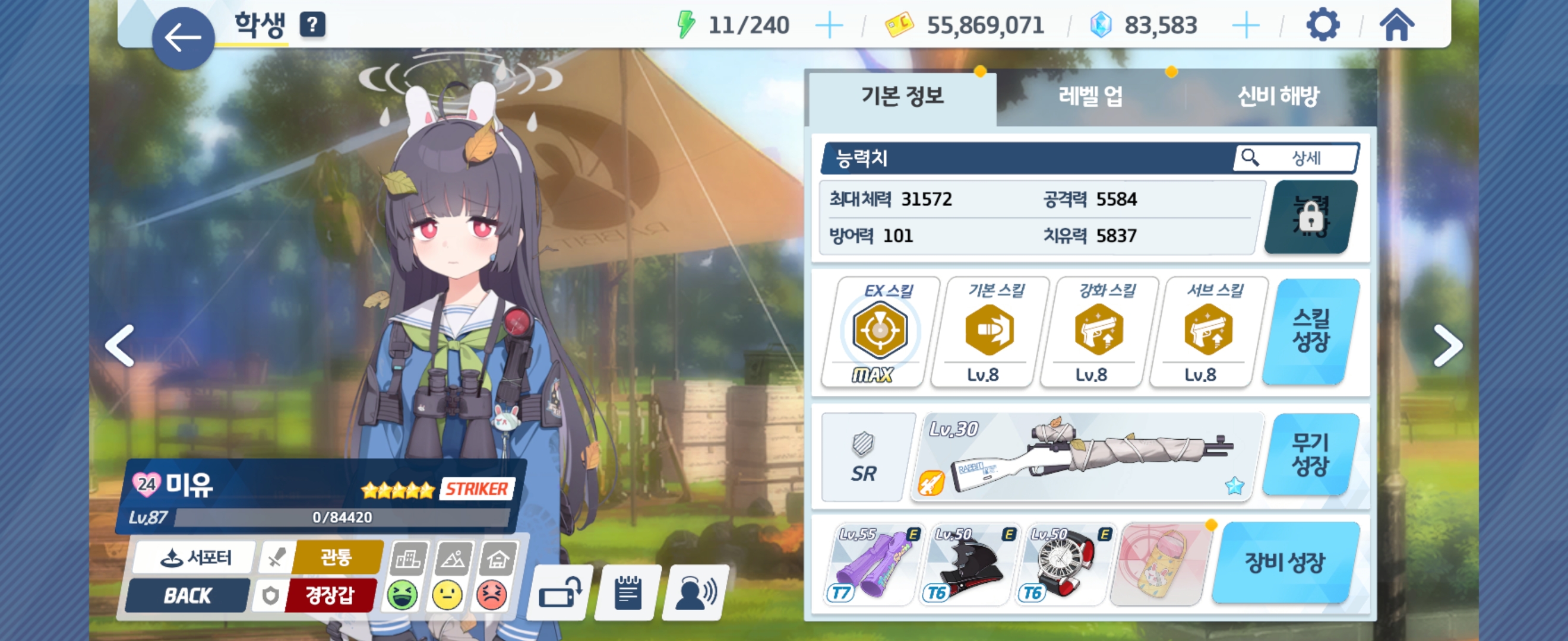 미유 Lv87 - 전무 1성, Ex 스킬 Max, 기본 스킬 Lv8, 강화 스킬 Lv8, 서브 스킬 Lv8, 애용품(미착용)