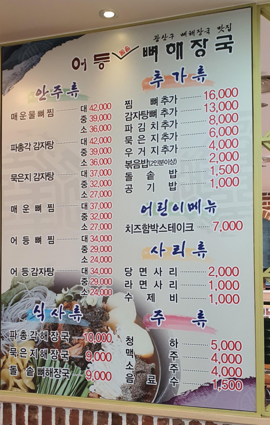 전날 회사 회식의 여파로 위장이 계속 뜨끈하면서 얼큰한 국물을 부어달라고 보채서 점심에 먹을 해장국집을 찾다가 광주 하남산단에 있는 홈플러스 맞은편의 먹자골목 쪽에 위치한 "어등뼈해장국"에서 위장을 달래줄 심산으로 점심시간이 되자마자 부리나케 방문해 보았습니다.