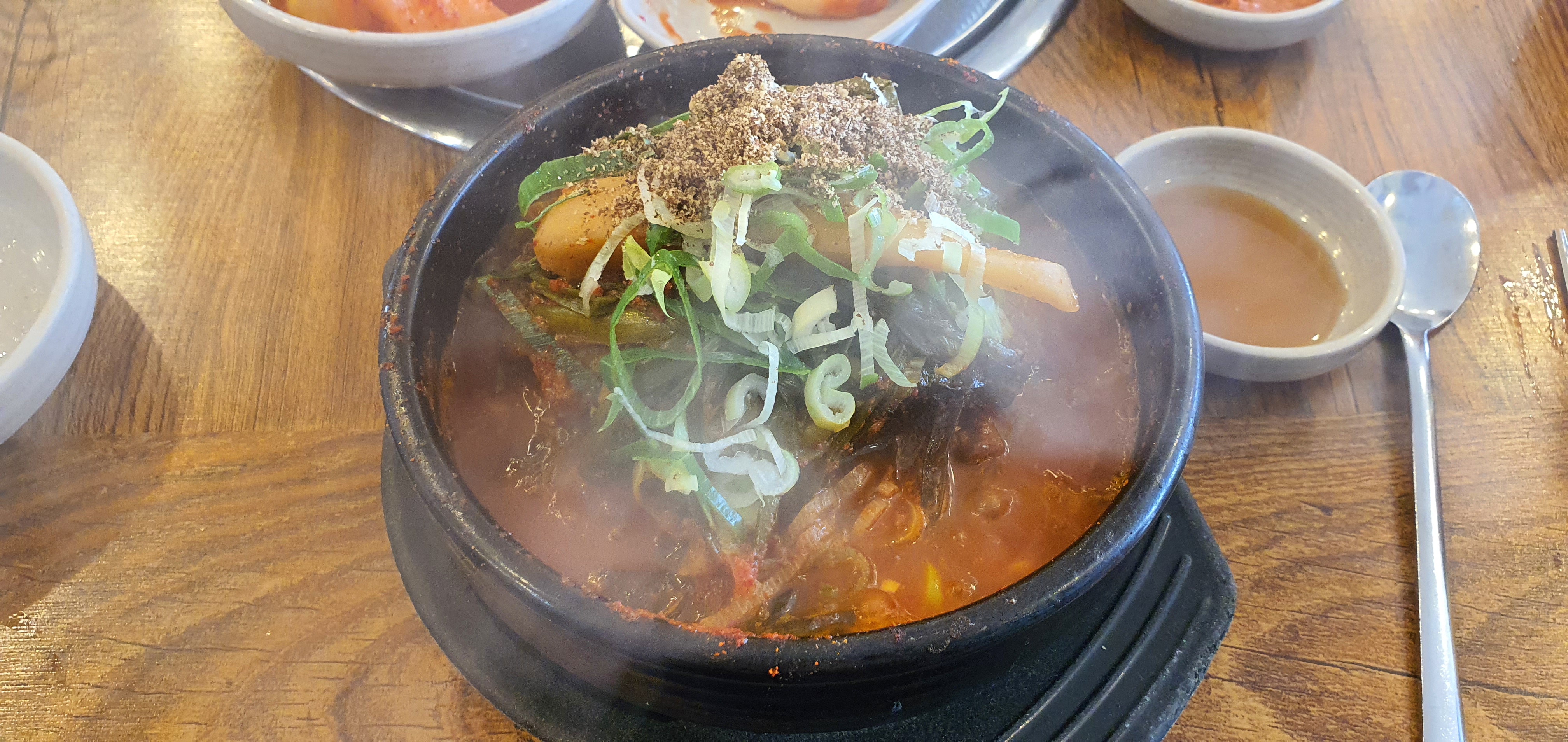 주문한 메뉴는 대략 10분 좀 안돼서 나온 듯했으며, 향이 김치찌개 보다 좀 더 진한 느낌의 전골 같은 냄새가 나면서 침샘을 자극했습니다. "파총각 해장국"의 내용물은 뼈찜이 크게 두 덩이가 아래에 놓여 있으며 그 위를 수북하게 파가 덮은 모양새였으며 맨 위를 총각김치 한 덩이가 터 하니 얹혀 있고 그 위를 들깨가루가 고슬고슬 맺혀 있는 맛있어 보이게 이쁜 비주얼이었습니다.