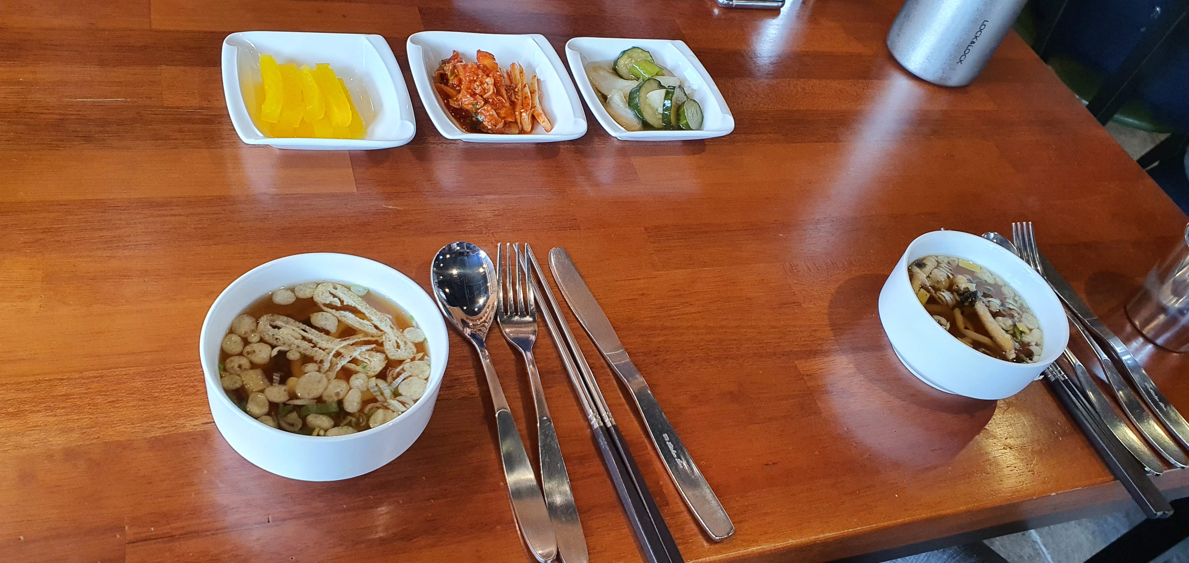 주문을 하면 정말 정갈한 느낌의 수의 반찬이 제공됩니다. 단무지, 배추김치, 오이 양파 간장절임류(?)와 미니우동을 한 그릇씩 줍니다. 참고로 짬뽕우동을 시켰던 사람한테는 별도로 미니 우동이 별도로 제공되진 않았습니다. 대신 짬뽕에 들어간 조개껍데기를 발라내라고 빈그릇 하나를 주셨습니다.