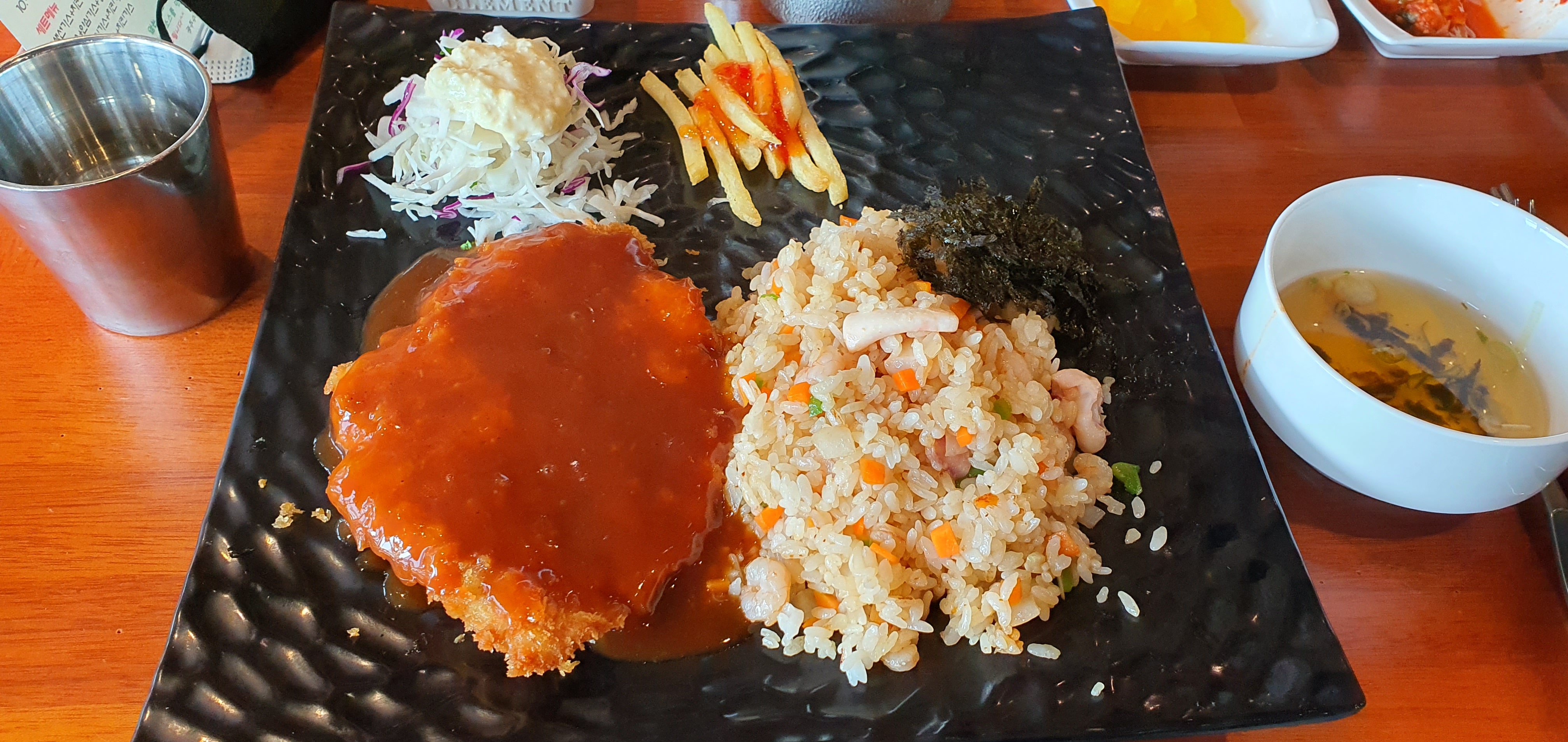 볶음밥 위에 김가루가 뿌려져서 나오는 것과 감자튀김이 나오는 게 특색 있네요. 너무 배고파서 중간에 사진 찍을 생각을 못했습니다만 돈가스의 맛은 일단 평타급의 맛이었습니다. 안의 고기도 질기지 않고 씹는 맛이 있었으며 돈가스 튀김도 그렇게 두껍지 않았으며 나이프로 잘 썰리는 게 좋았습니다. 그리고 제가 개인적으로는 일반 시판용 돈가스 소스를 별로 좋아하진 않는 편인데 여기는 시판이었는지 아니면 직접 소스를 만드시는지는 모르겠지만 소스 맛이 그렇게 나쁜 편은 아녔습니다. 볶음밥도 고슬고슬하니 잘 볶아졌으며 강한 맛없이 해물의 맛과 향이 나는 밥이었습니다.