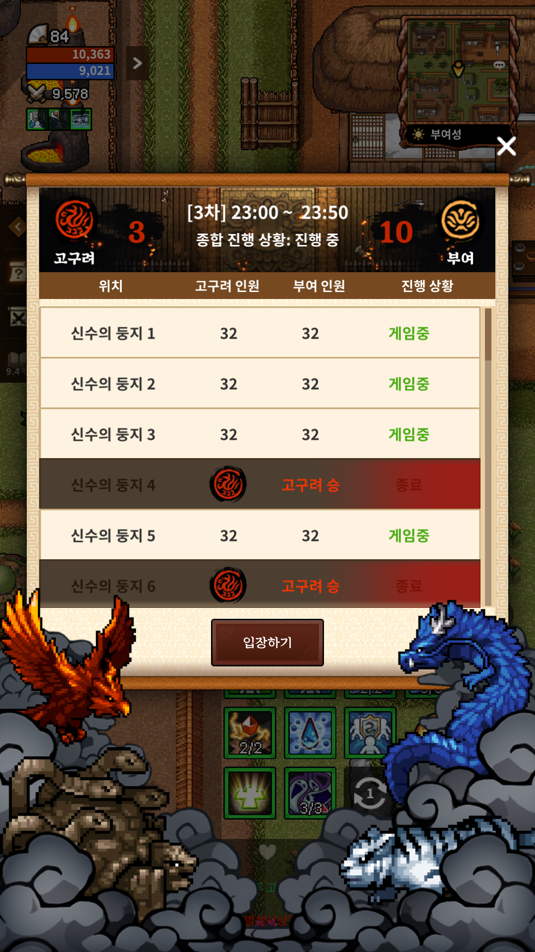 신수 쟁탈전 아이콘을 누르게 되면 하기와 같이 진행 중인 신수 쟁탈전에 관한 종합 진행상황 현황이 보이게 되며 고구려와 부여 간의 점수 차이와 참여할 수 있는 둥지의 현황을 알려줍니다.