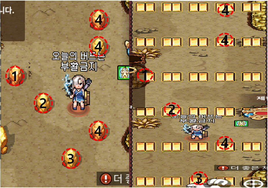 상기의 순서대로 아래에서부터 진입을 해야 하므로 숫자를 연상시켜 진입한다고 가정하면 3-4-2-1-4-4의 순서대로 금화를 밟게 되면 절대 터질 일 없이 안전하게 몹한테 다가갈 수 있습니다. 참고로 자동 사냥 모드일 때에는 수동으로 캐릭터를 이동시키게 되어도 자동사냥의 여파로 캐릭터가 자기 멋대로 움직여서 엉뚱한 금화를 밟아서 터질 수가 있으니 가급적 이 금화 지뢰밭을 지나갈 때만큼은 자동사냥 모드를 꺼놓고 오직 수동으로만 캐릭터를 이동시키면 편하게 이동이 가능하실 겁니다.